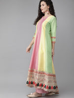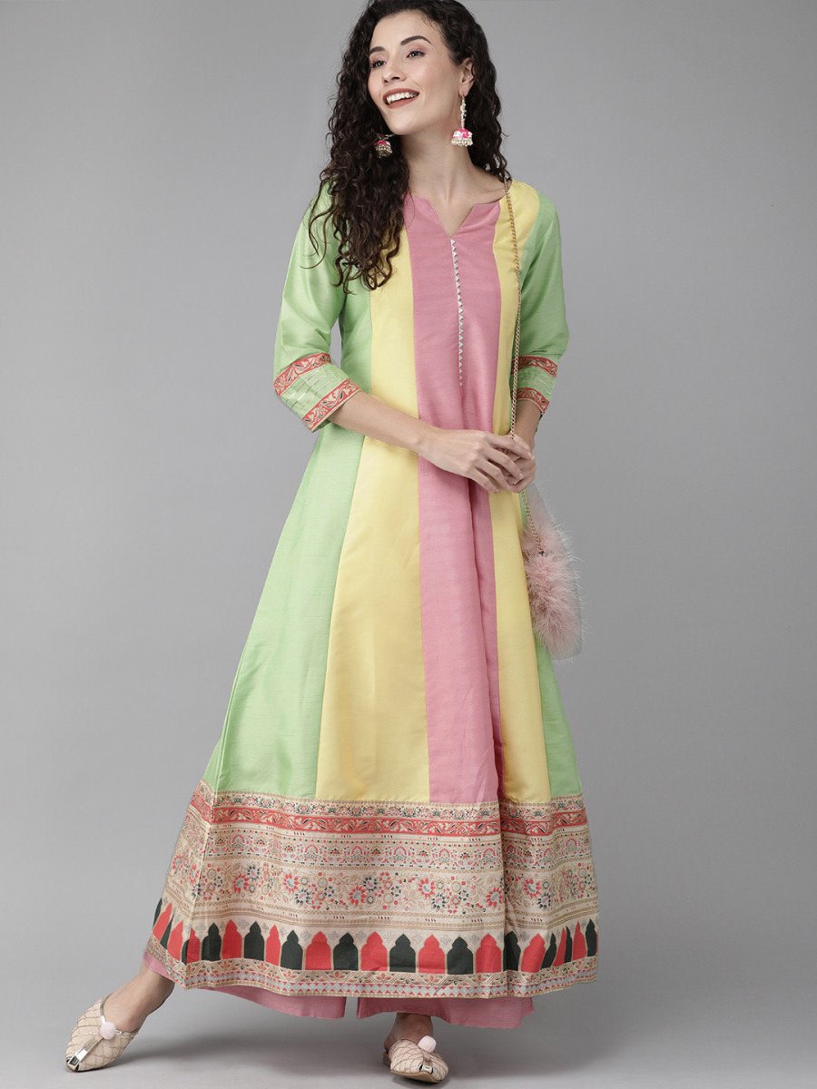 This anarkali kurta is a bright festive pick. The kurta has multicolored panels adorned by an eye-catching hand-printed border. The kurta comes along with a lower to match. Team it up with your golden juttis, and jhumkas.