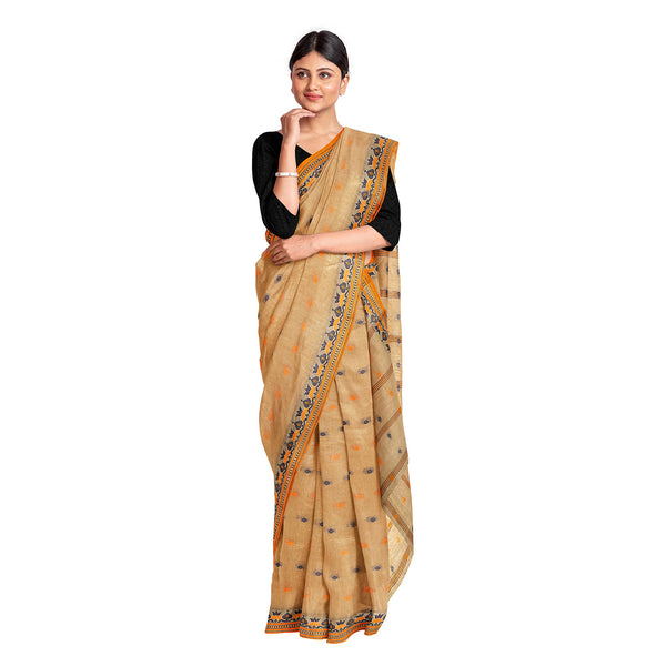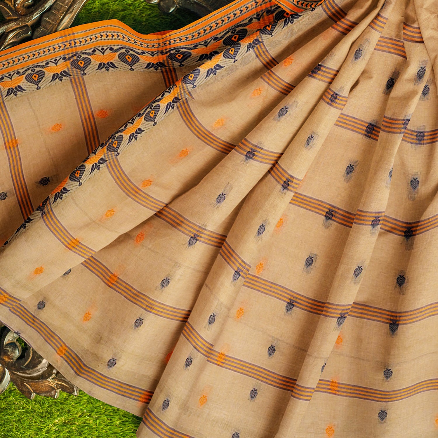 Exclusive Collection 100% Pure Cotton Biege Tant Saree With Hand Weaving Work