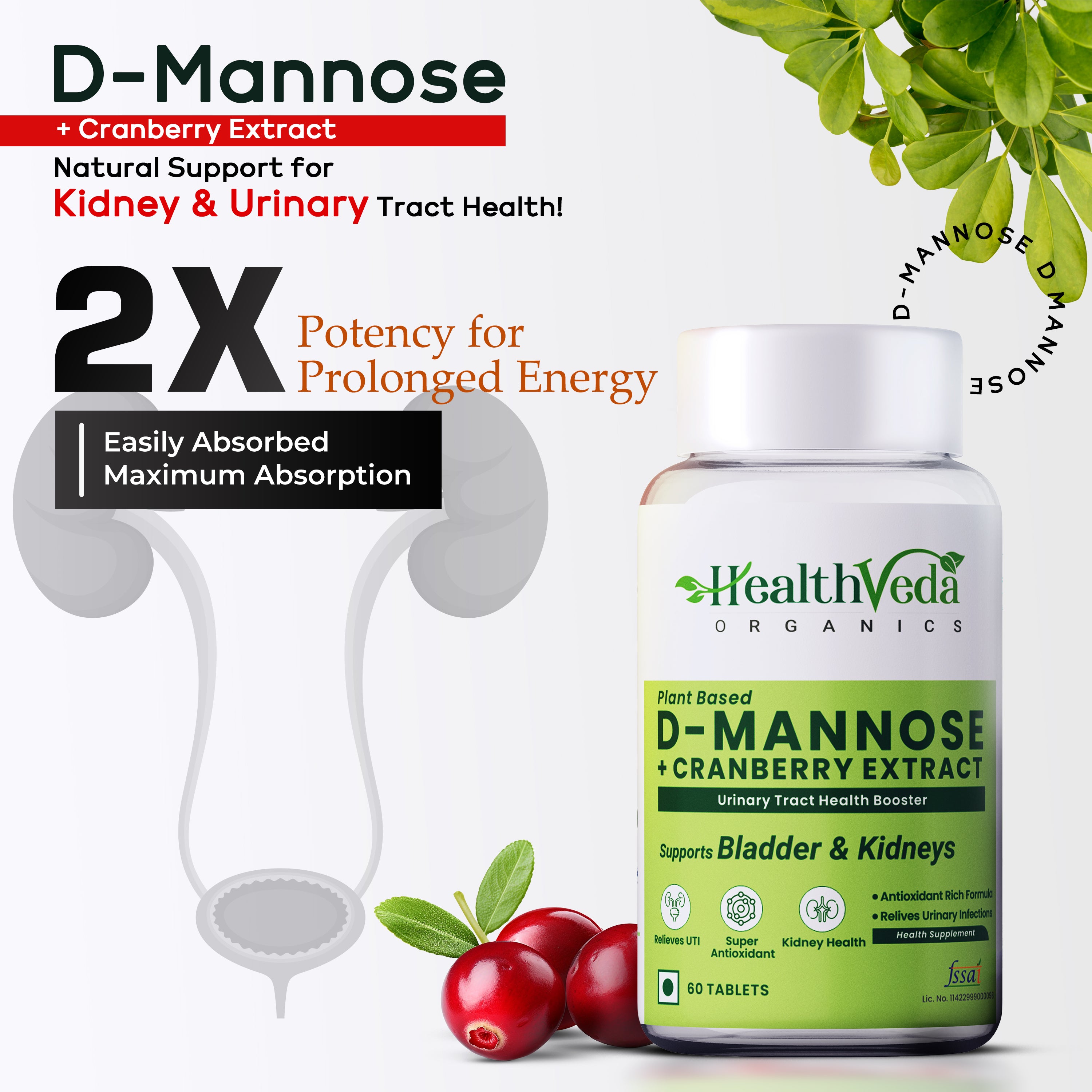Health Veda Organics D-Mannose + Cranberry Extract Tablets
