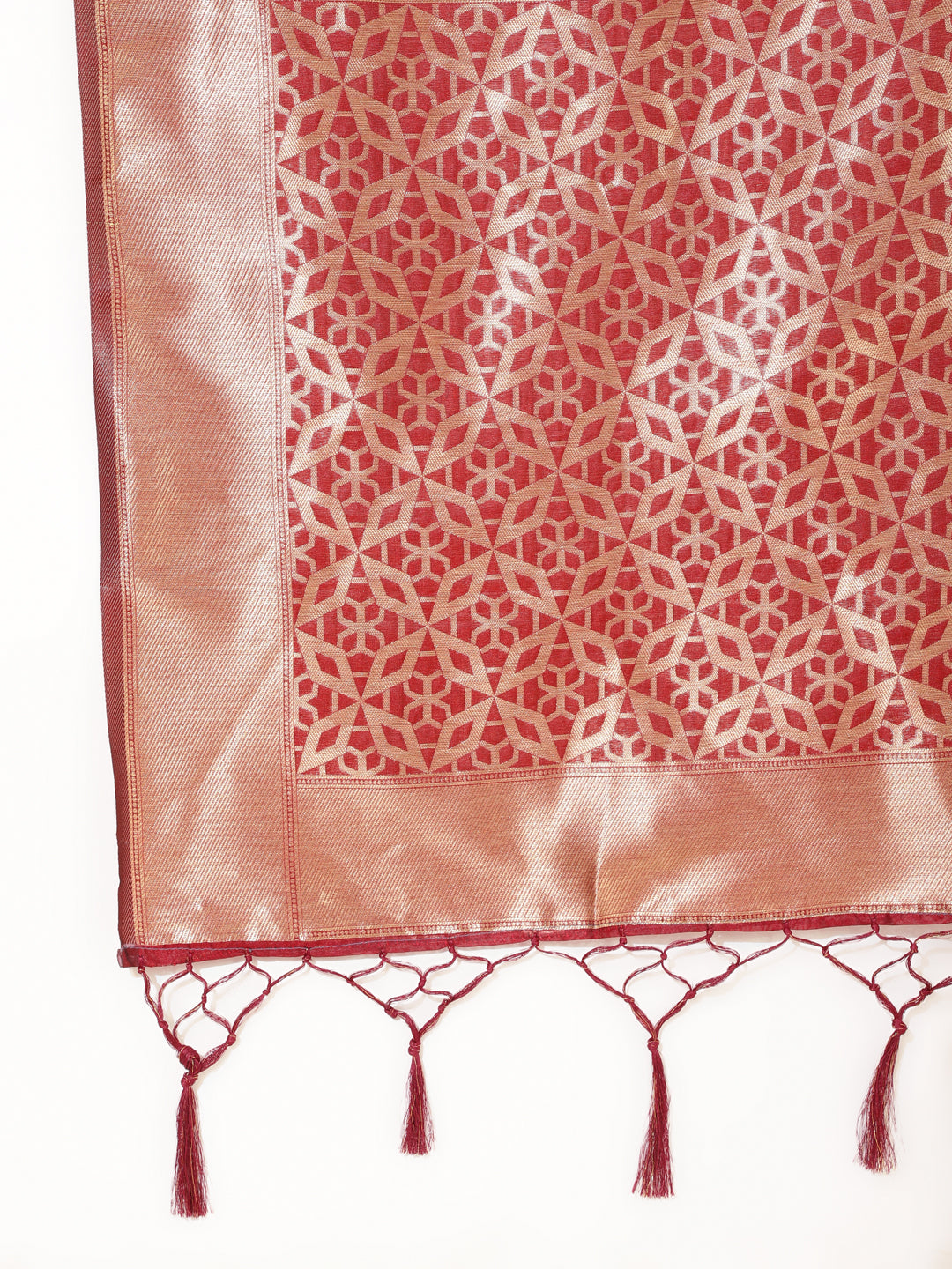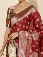 Janasya Maroon Organza Woven Ethnic Motifs Kanjeevaram Saree
