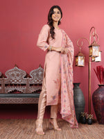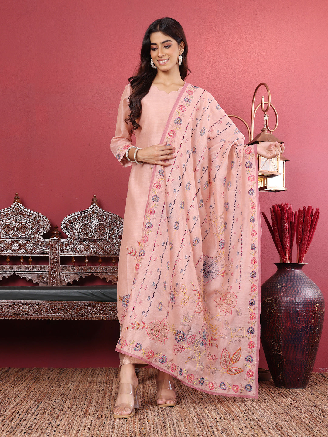 Pure Hand Kanth Embroidered, V Neck, Three Quarter Sleeves, Straight Kurta With Side Slit, Paired With Tonal Bottom And Embroidered Dupatta