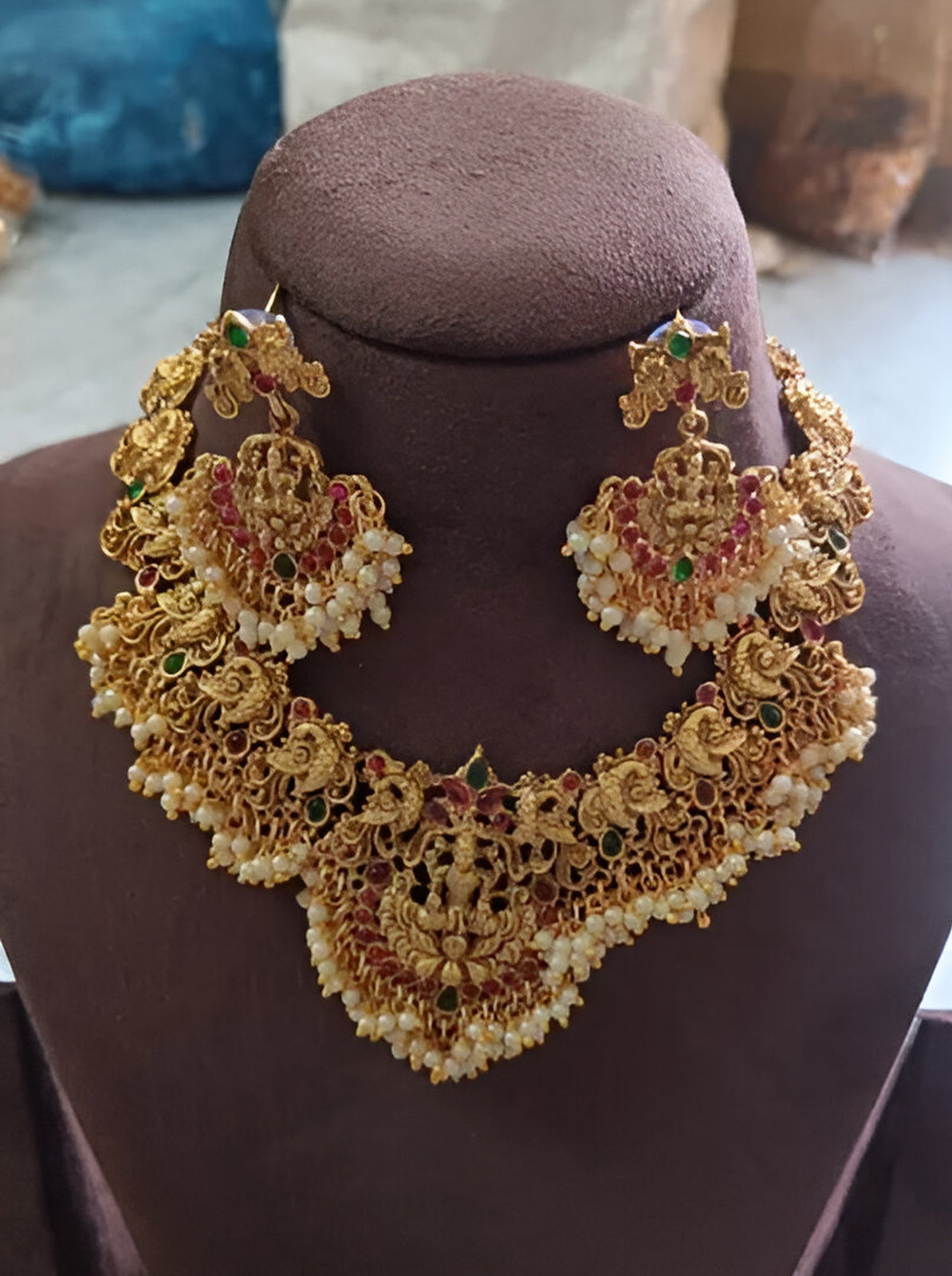 Designed to complement sarees, lehengas, and ethnic ensembles, this set includes a statement necklace and matching earrings, ensuring a regal and majestic look. Whether you're a bride or attending a special event, this royal South Indian temple jewelry adds an aura of sophistication and grace.