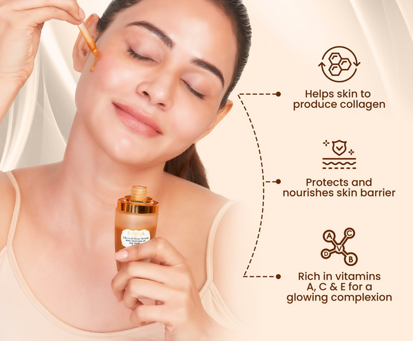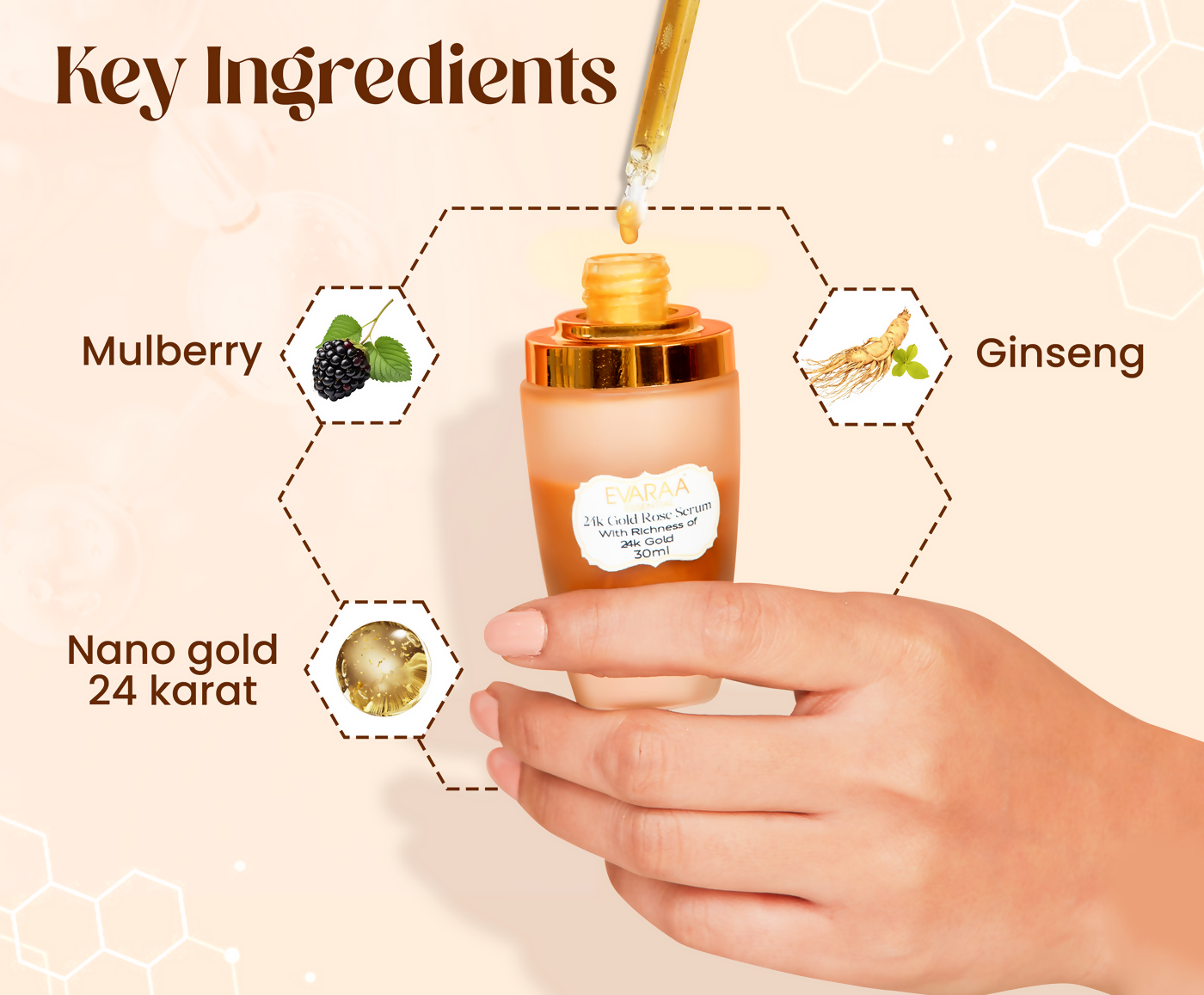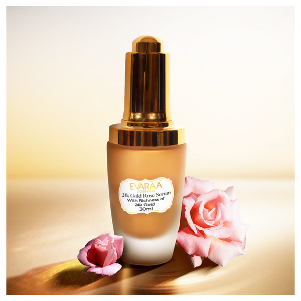 Evaraa Essential 24k Gold Rose Serum: This serum includes 24K nano gold, rose extract, Aloe Vera extract, citrus fruit enzymes, beta arbutin, koji...