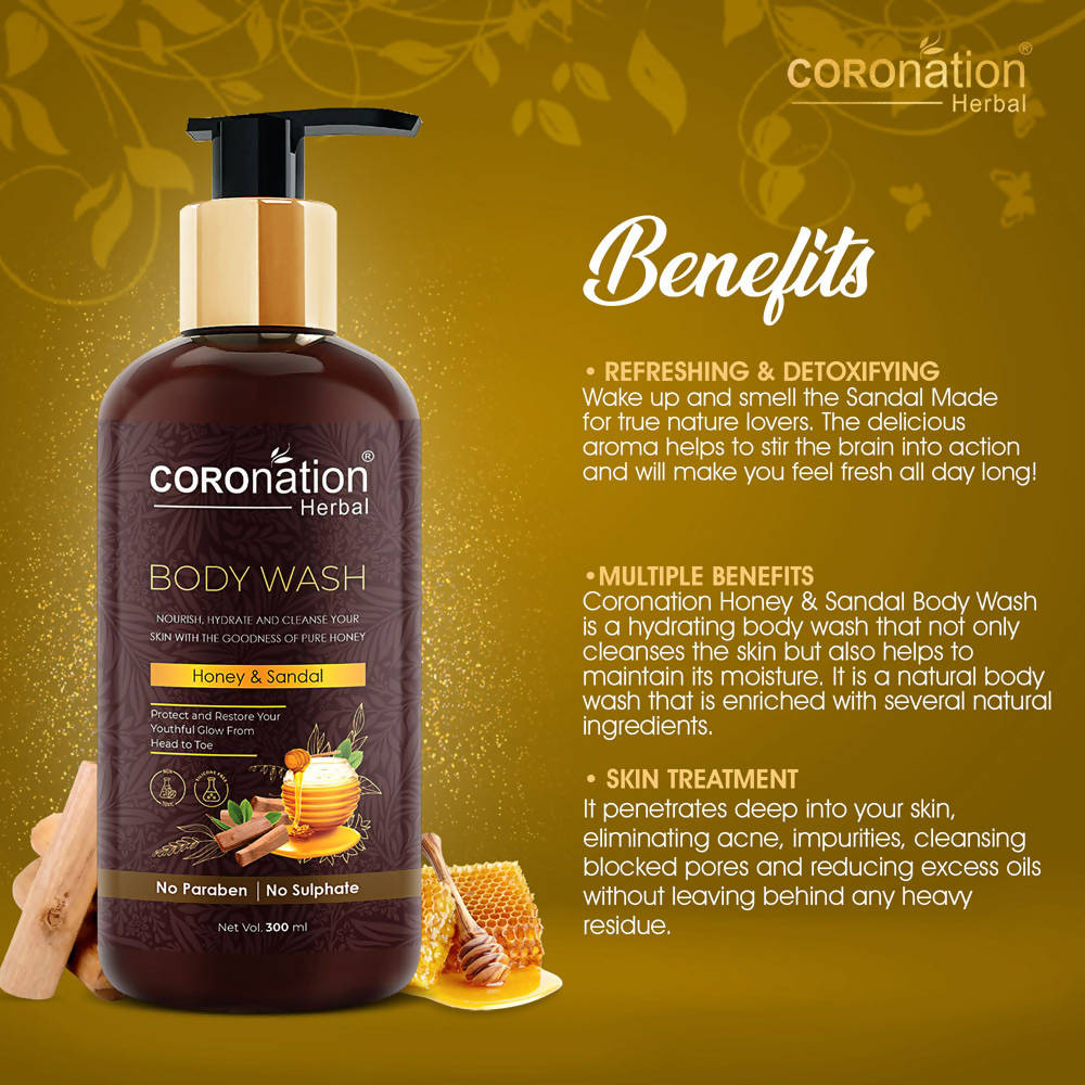• MULTIPLE BENEFITS: COROnation Honey & Sandal Body Wash is a hydrating body wash that not only cleanses the skin but also helps to maintain its moisture. It is a natural body wash that is enriched with several natural ingredients.