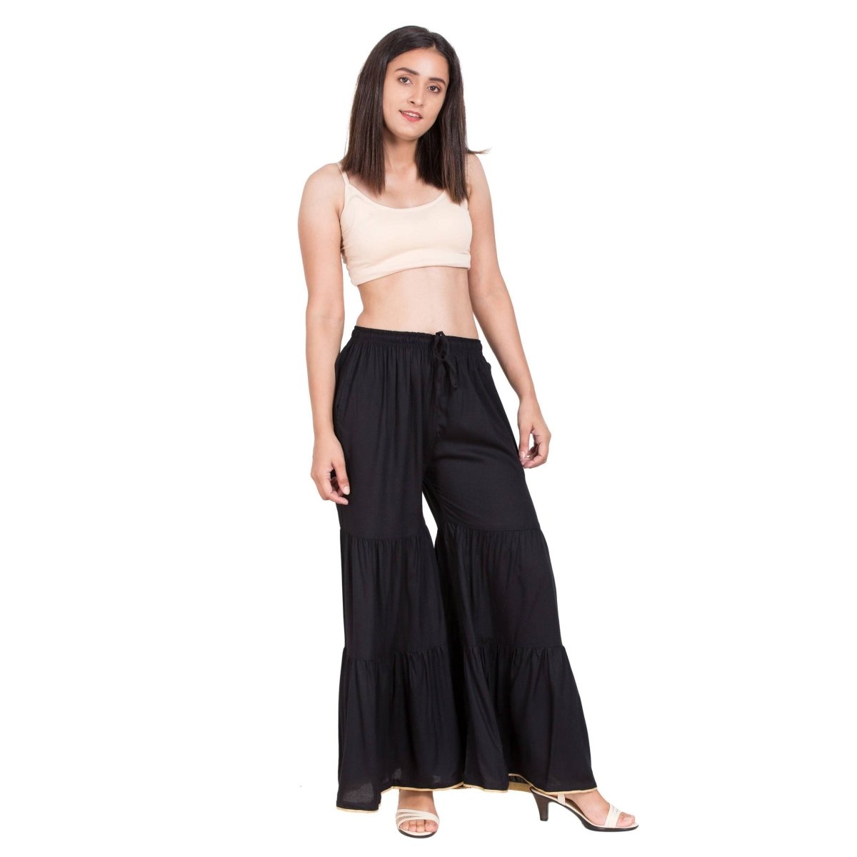 The Stylish Solid Flared Gharara made of Rayon Fabric with Full elastic at the waist which makes comfortable for wearing. A beautiful Golden Round lace at the bottom add grace to your personality. Perfect finishing and good quality Gharara,Keep your style breezy and chic.