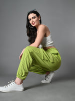 Myshka Women's Solid Ribbed High-Rise Cargo Style Casual Trousers in Green Color