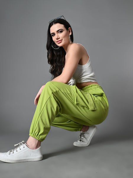Myshka Women's Solid Ribbed High-Rise Cargo Style Casual Trousers in Green Color - Distacart
