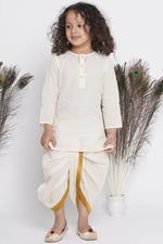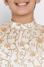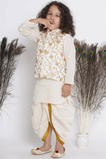 Little Bansi Banarsi Silk Orange Pink Floral Embroidery Jacket With Cotton Kantha kurta And Kantha Dhoti - Cream