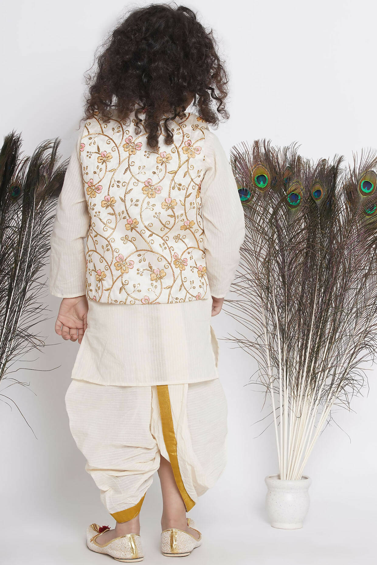 Little Bansi Banarsi Silk Orange Pink Floral Embroidery Jacket With Cotton Kantha kurta And Kantha Dhoti - Cream - 0-3 M