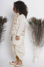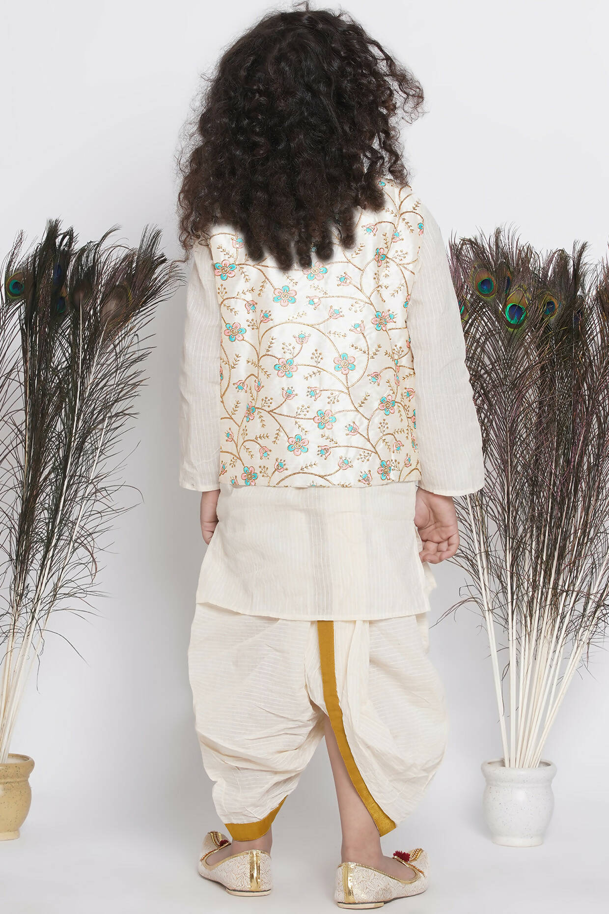 Little Bansi Banarsi Silk Pink Blue Floral Embroidery Jacket With Cotton Kantha kurta And Kantha Dhoti - Cream