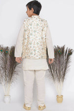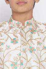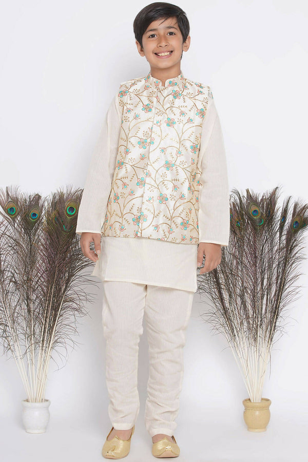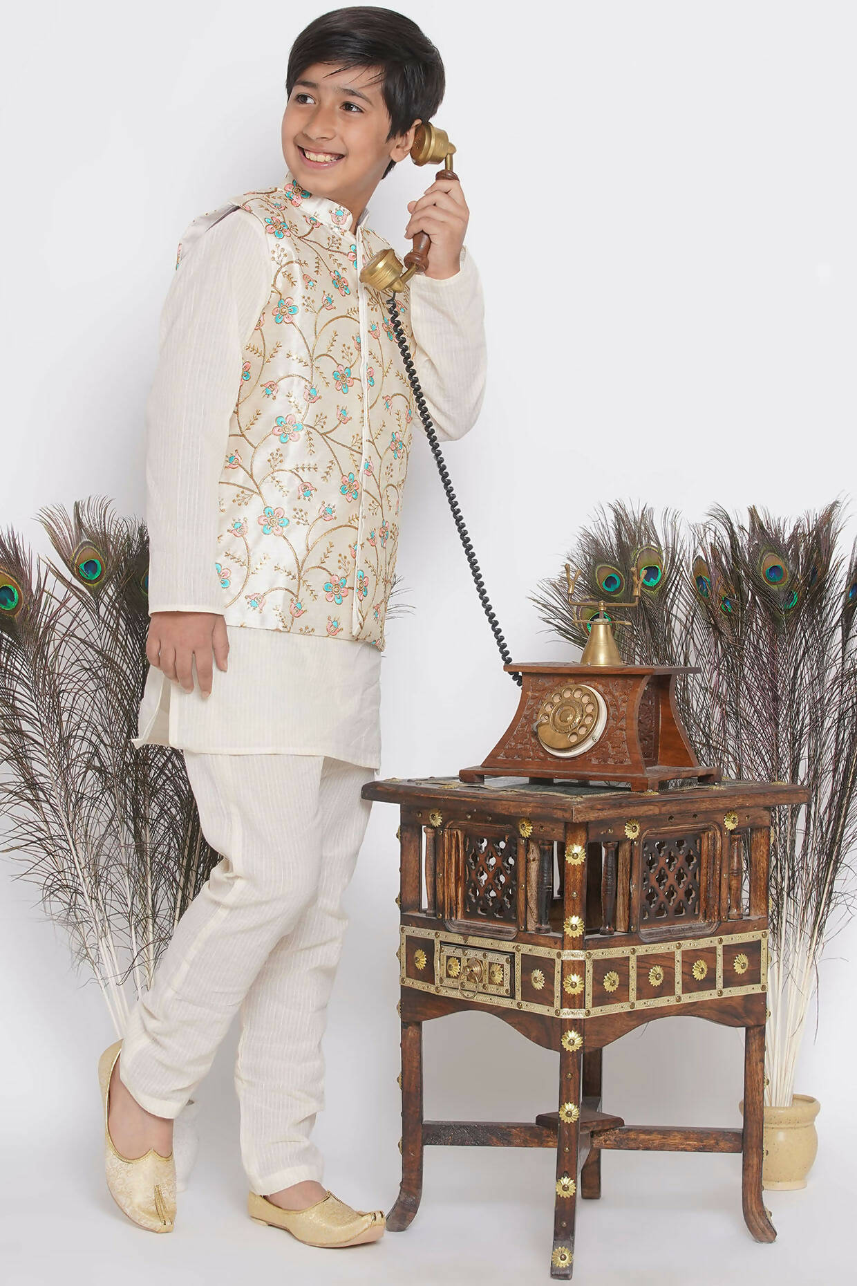 Little Bansi Banarsi Silk Pink Blue Floral Embroidery Jacket with Cotton Kantha kurta and Kantha Pyjama - CreamAdditional Information: Color: Cre...