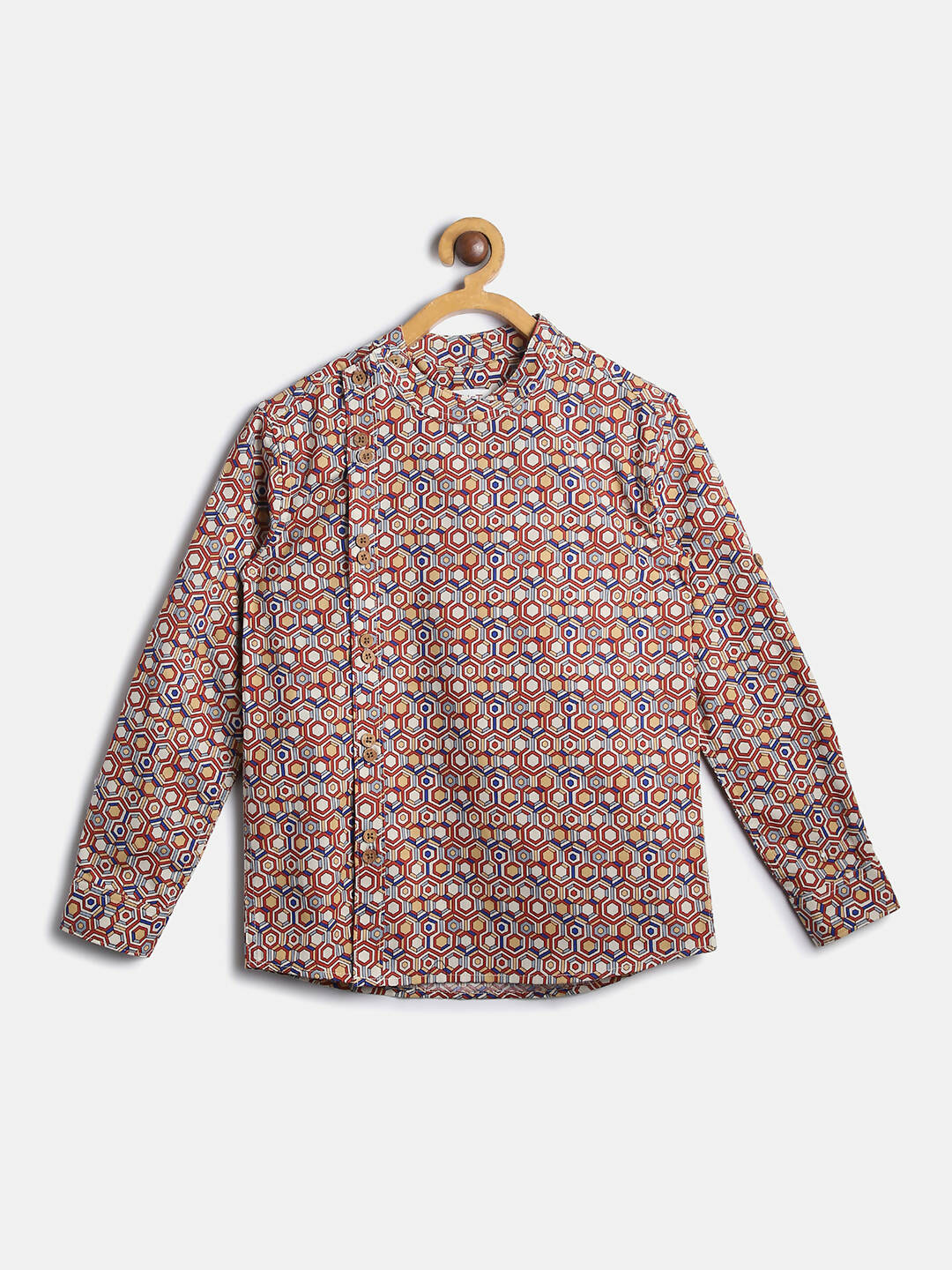 MANET Indo style Full Sleeves shirt is most desirable style during special celebrations. Made in 100% Cotton Fabric , it comes with beautiful prints  making it worthwhile. The wooden buttons are placed keeping in mind design and comfort for every child