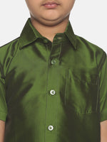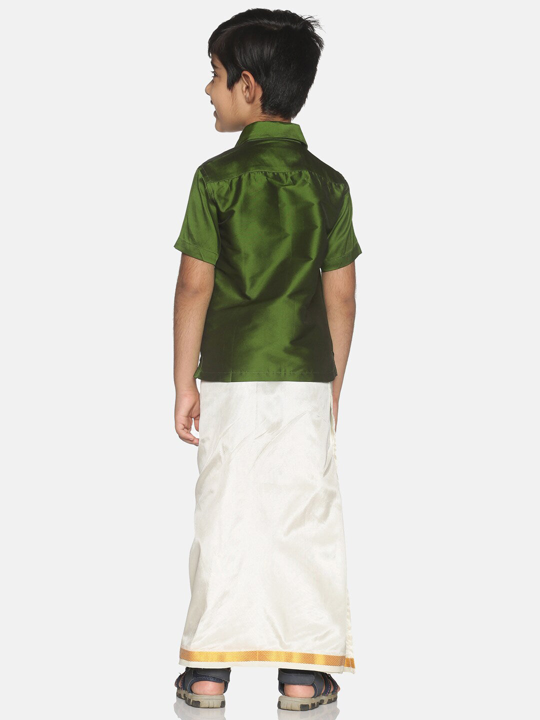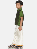 Sethukrishna Olive Green & White Solid Shirt and Veshti Set For Boys