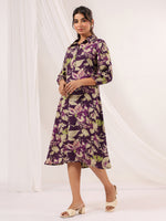 Janasya Dark Cotton Floral A-Line Dress - XS