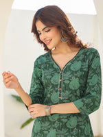 Janasya Dark Cotton Floral Straight Kurta Set - XS