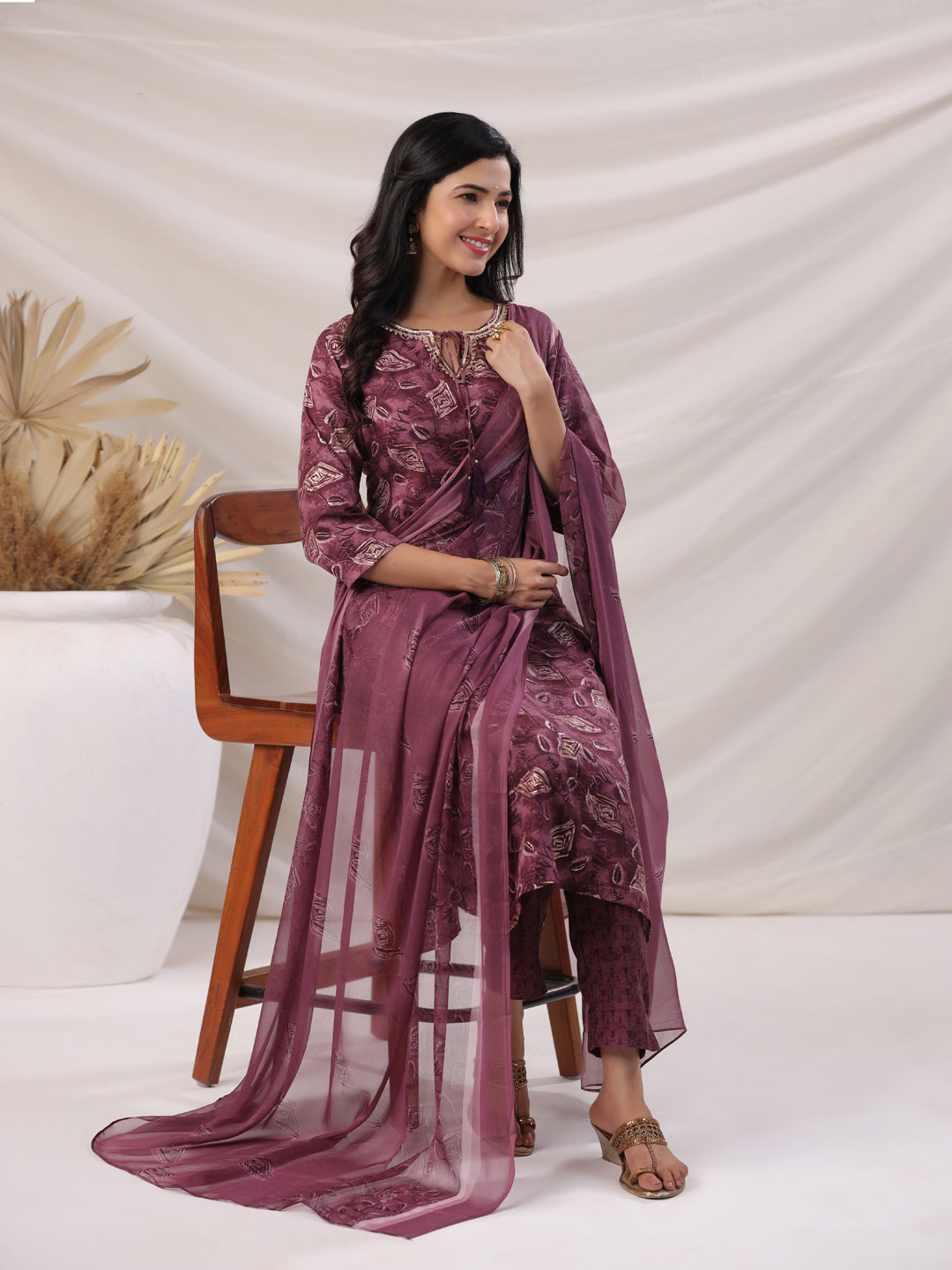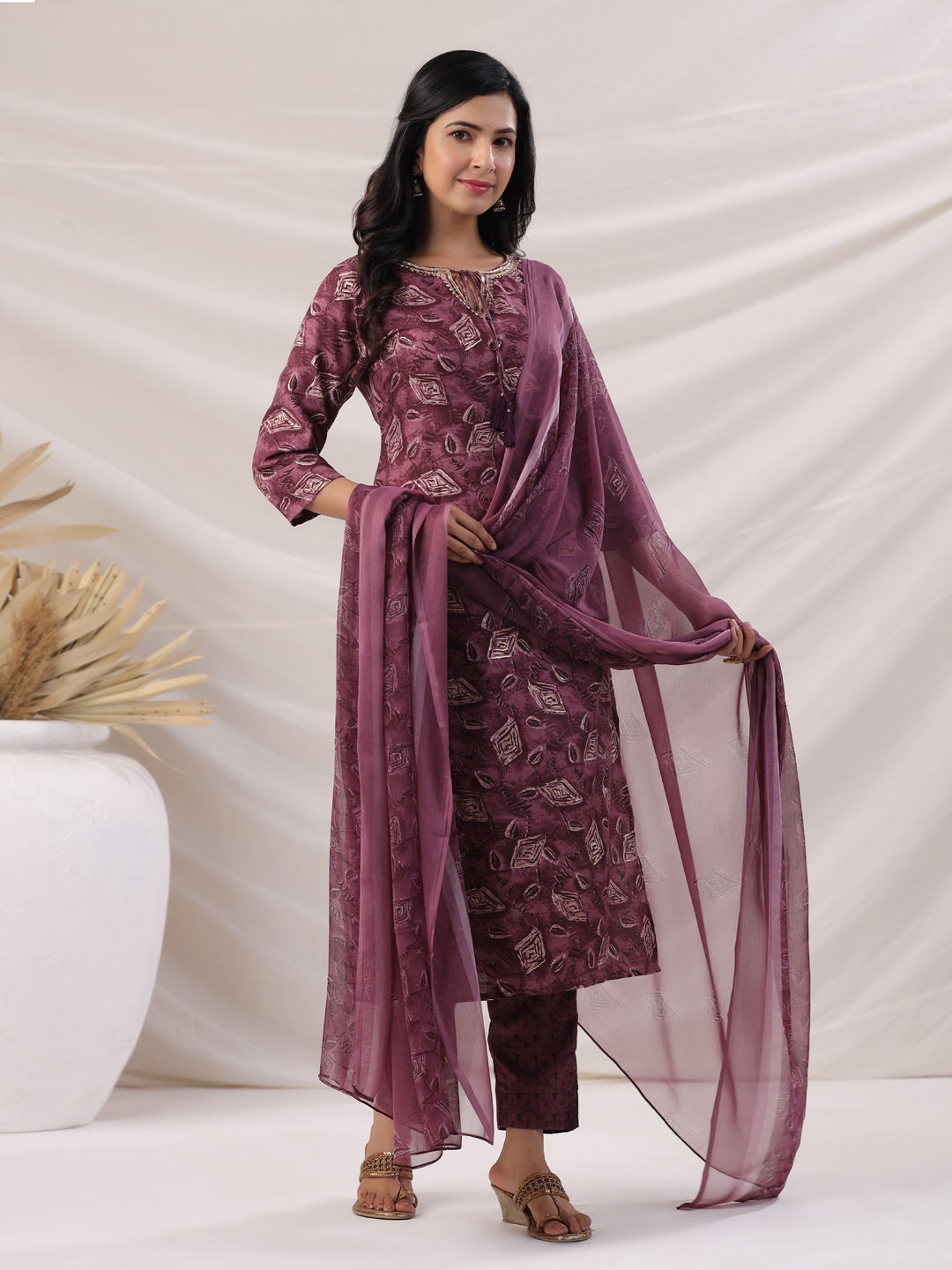 Janasya Regular Biscuit Slub Violet Abstract Tie-Up Neck Kurta,Bottom & Dupatta - L