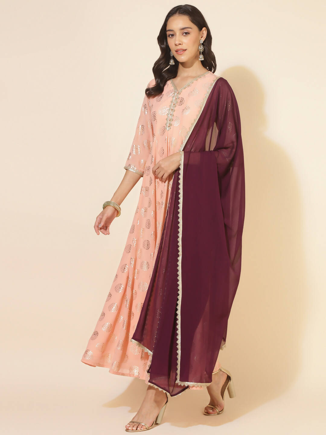 Janasya Women's Peach Georgette Foil Printed Festive Anarkali Kurta Set Top color: Peach Top Fabric: Georgette Top Pattern: Foil Printed Occasi...