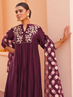 Janasya Women's Purple Chanderi Embellished Festive A-line Kurta Set