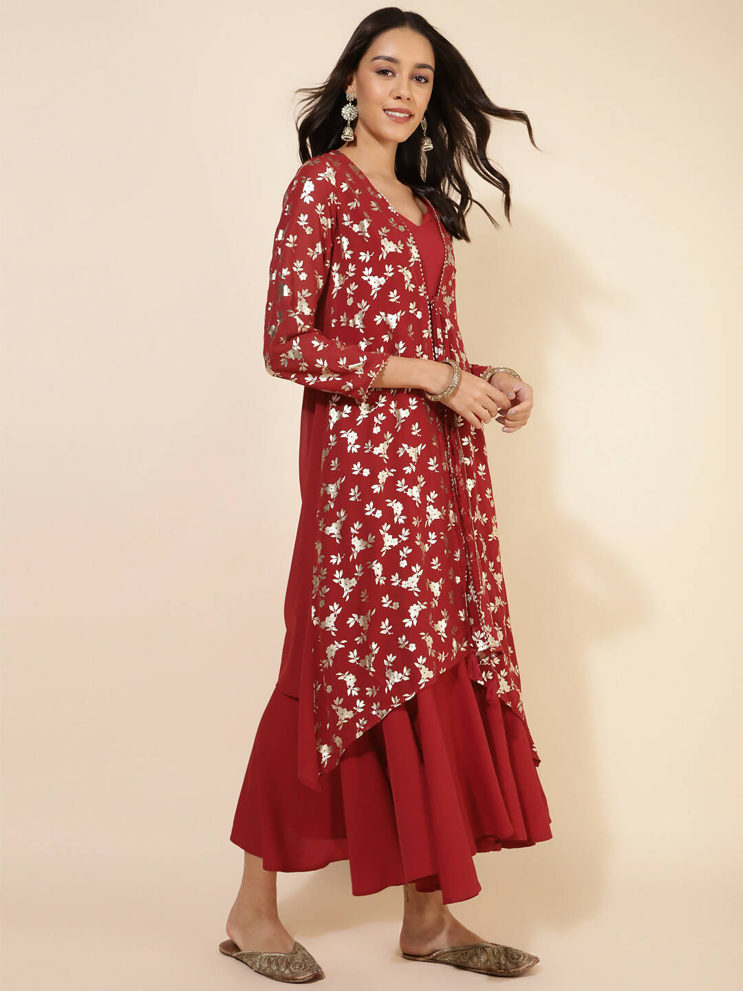 Janasya Women's Red Georgette Foil Printed Festive Flared Dress Set - Distacart