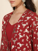 Janasya Women's Red Georgette Foil Printed Festive Flared Dress Set - XS