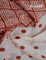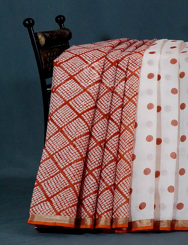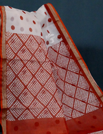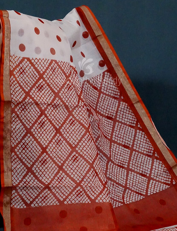SAREE : Shades of milk white and red colour saree with block design with patli pallu style , runs throughout the saree.