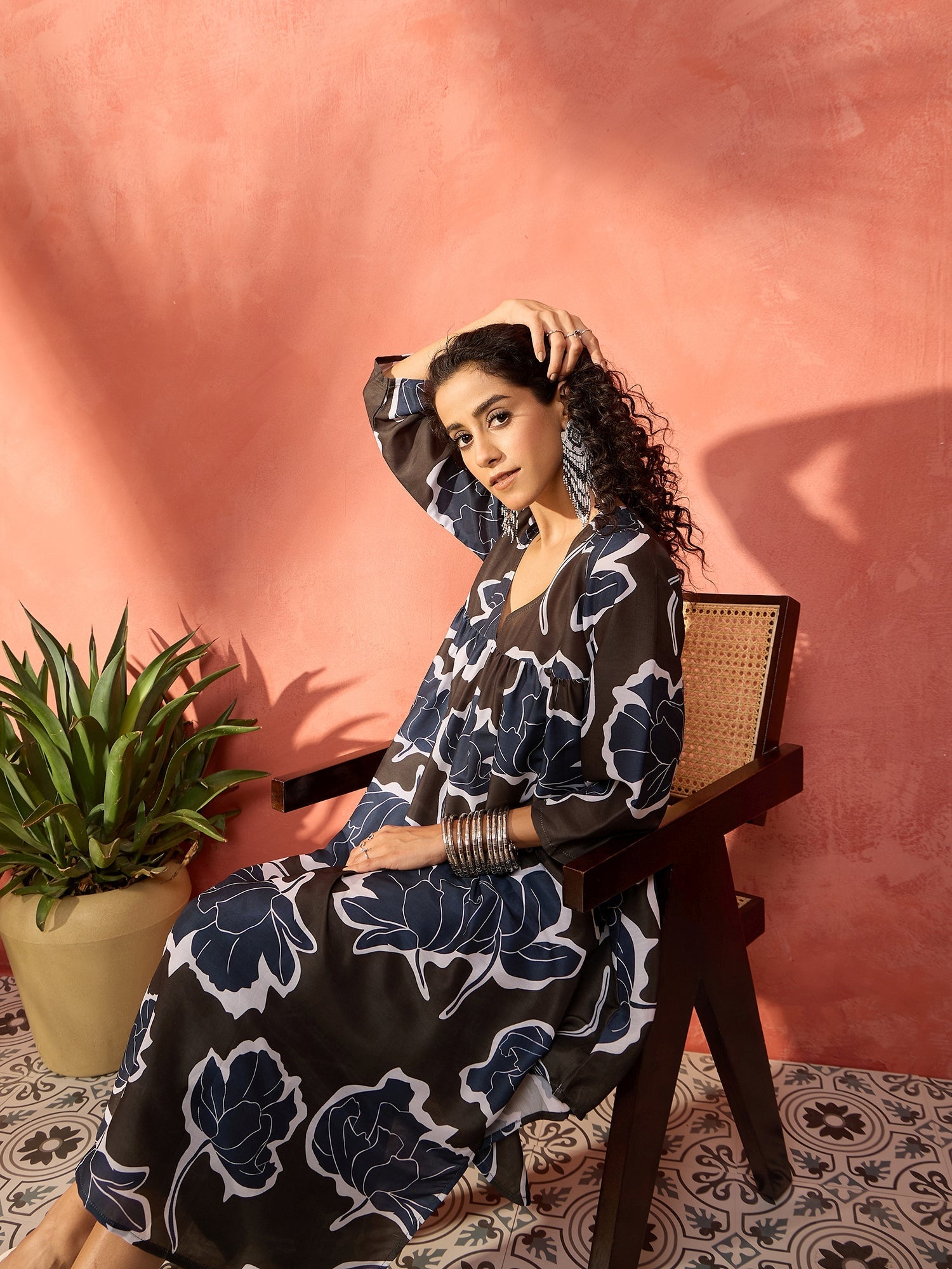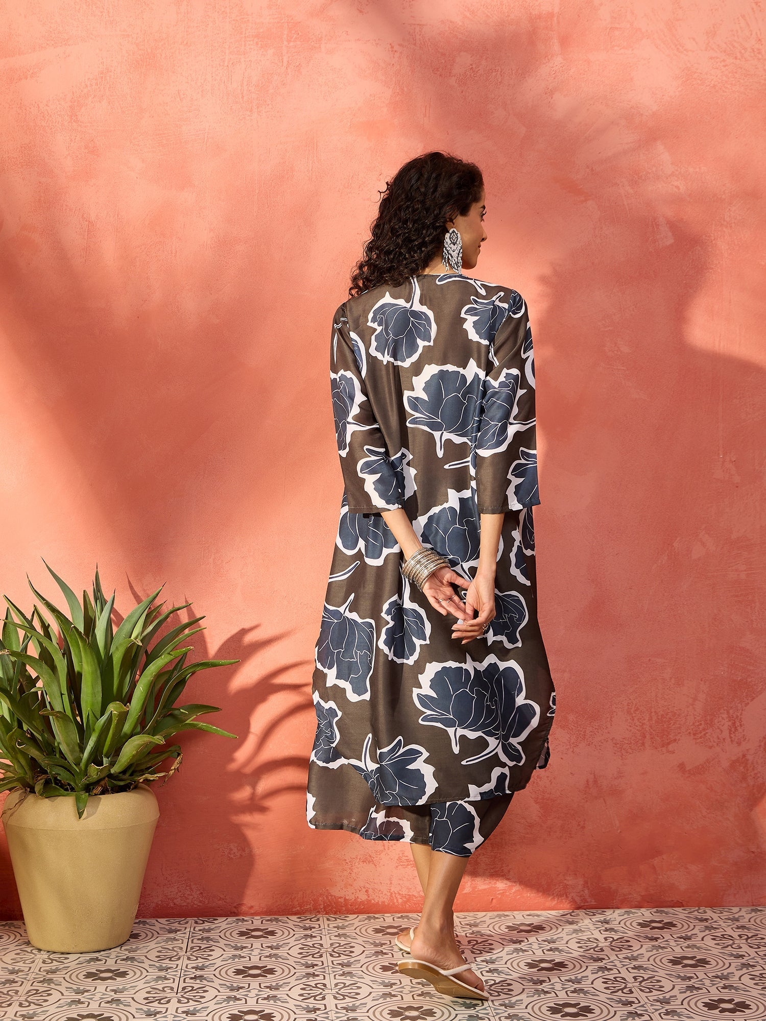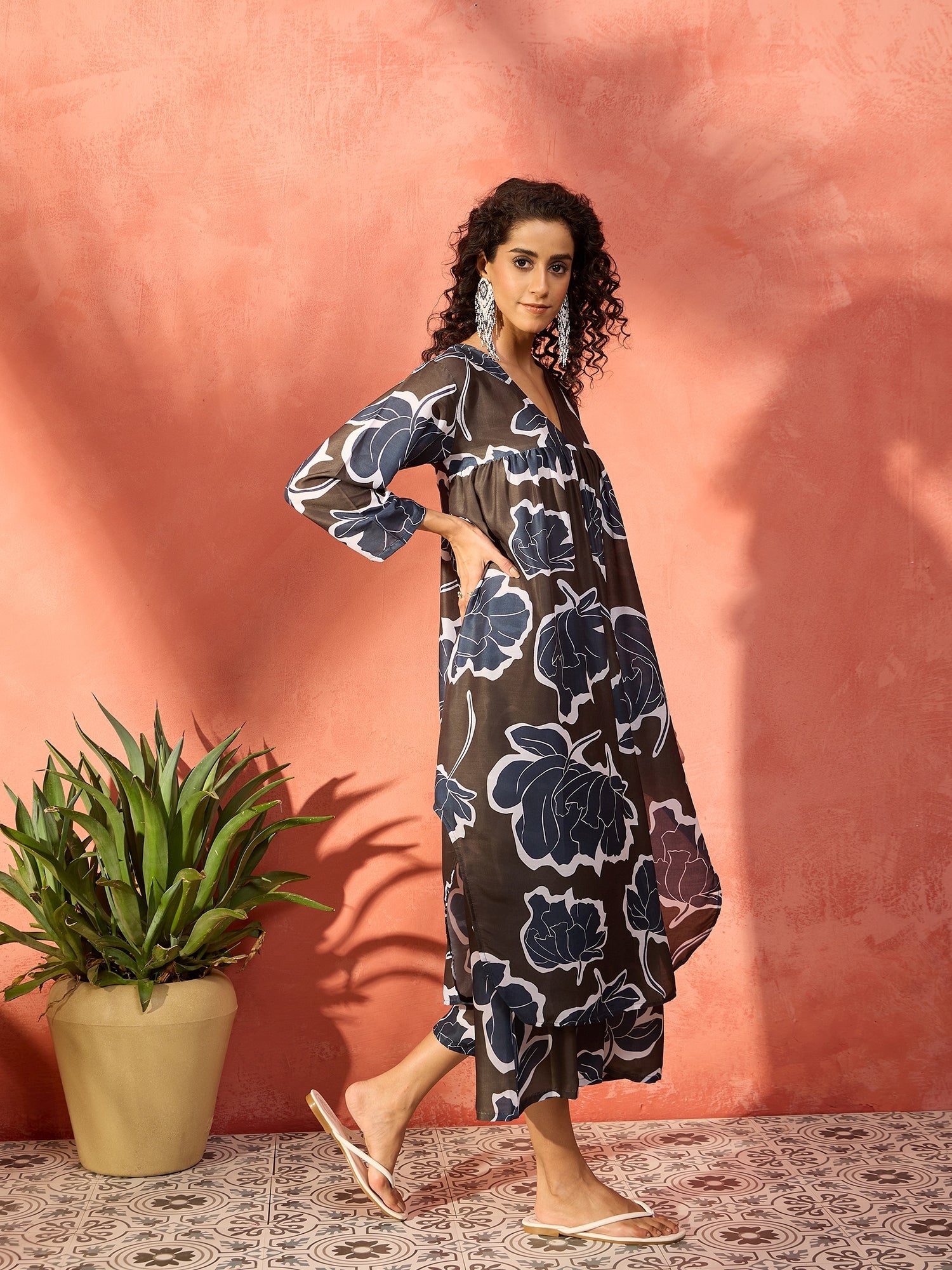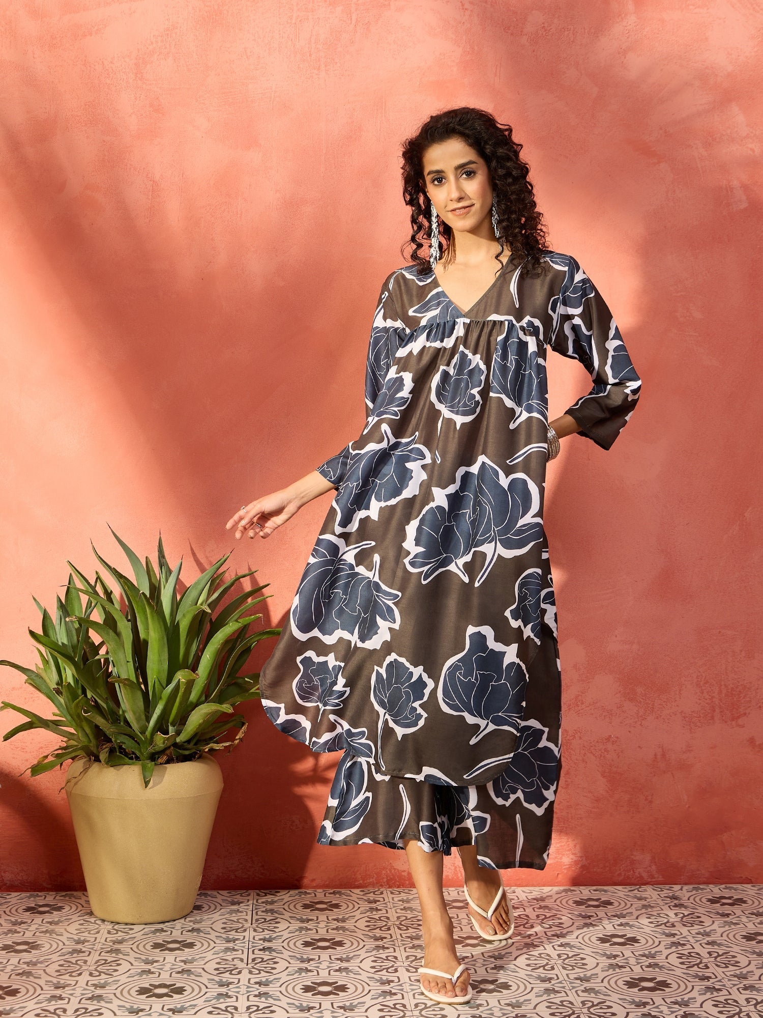 InWeave Mehendi Green Dark Teal Rose V Neck Flared Kurta Set