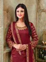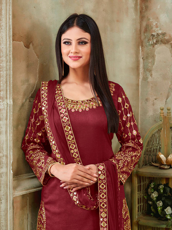 Red Art Silk Real Glass Work Suit features a art silk top with santoon top and santoon bottom. embroidery is completed with dori and stone work. This Style is made in India and checked by hand to ensure high quality.