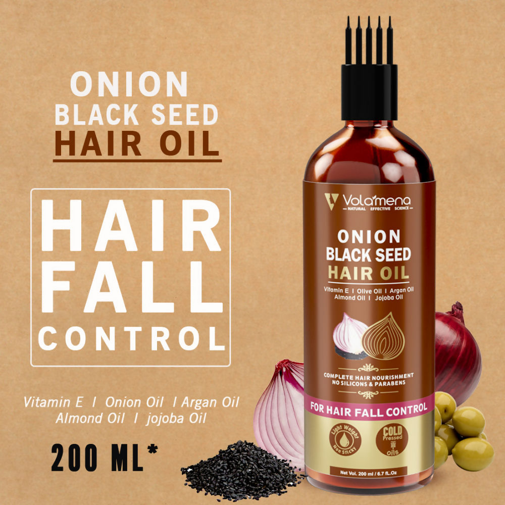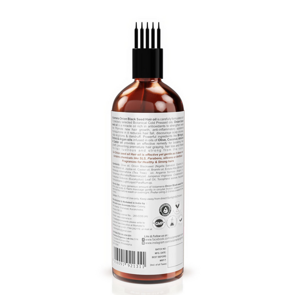 • Volamena Onion Black Seed Hair Oil is carefully formulated with 16 precisely selected botanical cold-pressed oils. Onion black seed oil is a miracle oil rich in antioxidants to strengthen weak hair and promote new hair growth. This hair oil contains the anti-inflammatory substance thymoquinone, which reduces hair fall, discourages scalp dryness, scalp eruptions and dandruff. Powerful ingredients like bhringraj, brahmi, and amla infused in oils of olive, coconut, almond and castor provide an effective remedy for boosting hair growth, preventing premature graying, hair loss and make the hair lustrous and strong from the roots.