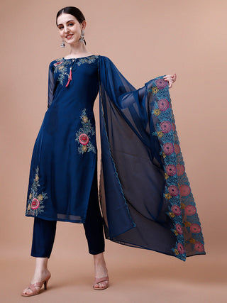 Placement Hand Embroidered Kurta With Pant & Embroidered Organza Dupatta, Multicolor - Hiral Fashion