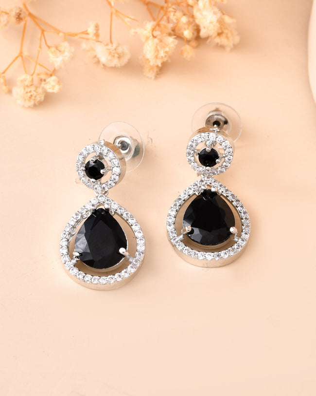 VOJ Silver Plated Black Stone Studded Teardrop Shaped Earrings