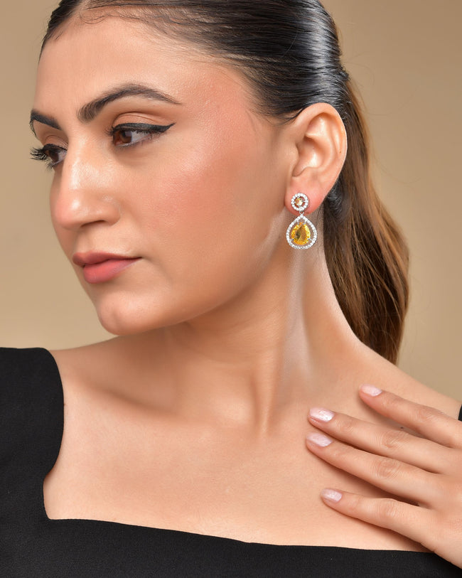 VOJ Silver Plated Yellow Stone Studded Teardrop Shaped Earrings