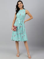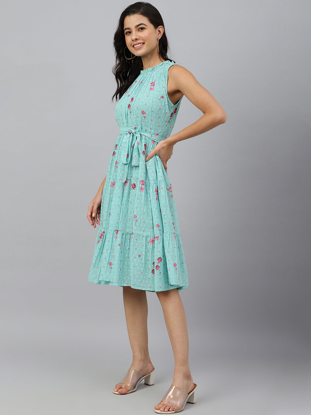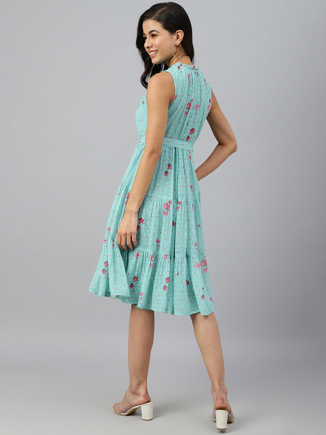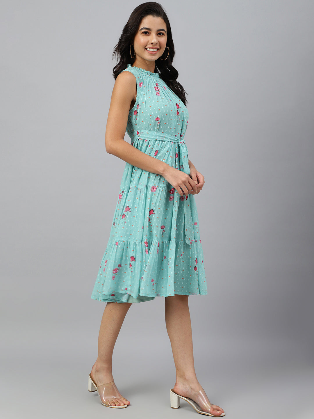 Janasya Women's Sea Green Dobby Georgette Floral Printed Tiered Western Dress Color: Sea Green Fabric: Dobby Georgette Pattern: Floral Printe...