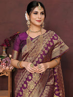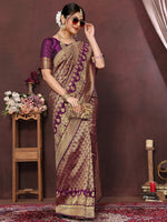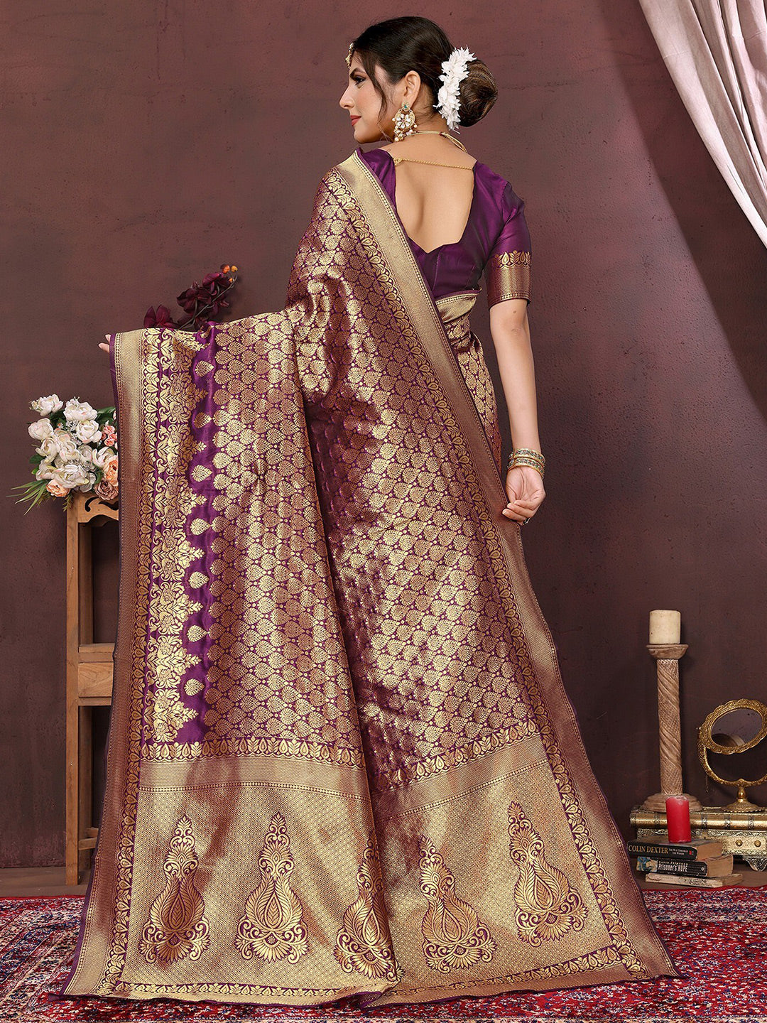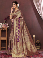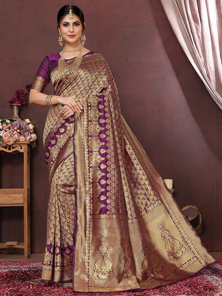 Kalini Ethnic Woven Design Zari Banarasi Saree Product Details Design Details Purple and gold-toned banarasi saree Woven design saree with wov...