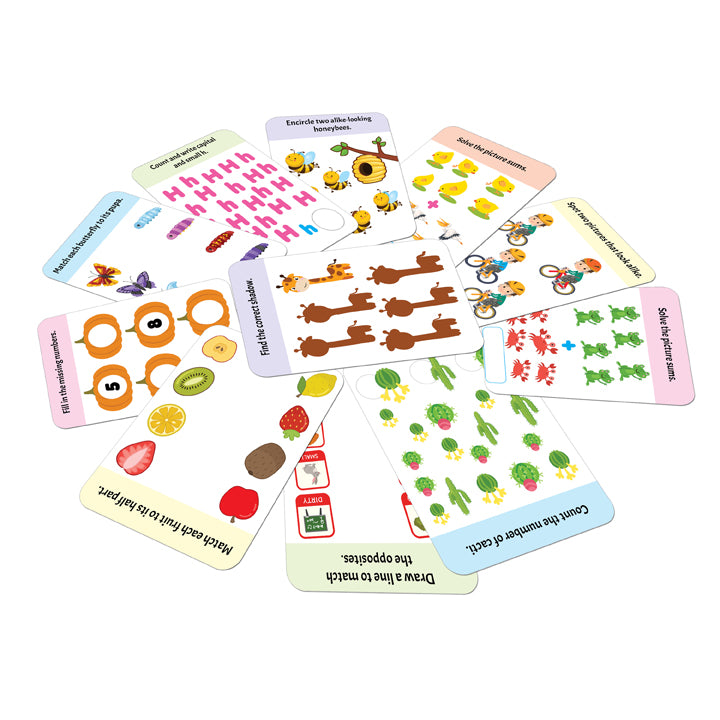 ‘Learn with Fun – Activity Flash Cards’ features colourful images and large easy-to-read text to reinforce the early learning skills of toddlers, preschoolers, and kindergartners. These cards offer a fun way for tiny tots to meet their early education needs. •Perfect for Preschool/Kindergarten •30 double-sided wipe-clean cards•Durable both-side laminated•Full-colour images on both sides•Size 14.25x10.5 cm•Rounded corners•Cute colourful box pack•A pen with an eraserPerfect for little hands these flash cards will help kids learn through rich and interesting colourful images. Making early education easy and fun, these durable cards can be wiped-cleaned and reused. This great learning tool is a wonderful gift for young learners.