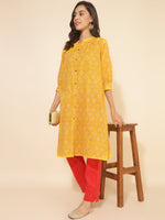 Janasya Yellow Cotton Bandhani Printed Casual Kurta - S