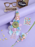 • Style Note: Celebrate Raksha Bandhan with the elegant NVR Set of 2 Handmade Multicolor Artificial Stones & Beads Bhaiya Bhabhi Rakhi. Crafted with artificial stones and beads, these Rakhis add a vibrant and festive touch to the occasion. The intricate handmade design makes them a perfect choice for your Bhaiya and Bhabhi. The adjustable thread ensures a comfortable fit for all wrist sizes. Complete with Roli, Chawal, Chandan, Mishri with Assorted MDF wooden stand & 33.6 gm Hershey's Kisses Chocolate, this set allows for the traditional Raksha Bandhan rituals. A meaningful and stylish gift to express love and blessings on this special day.