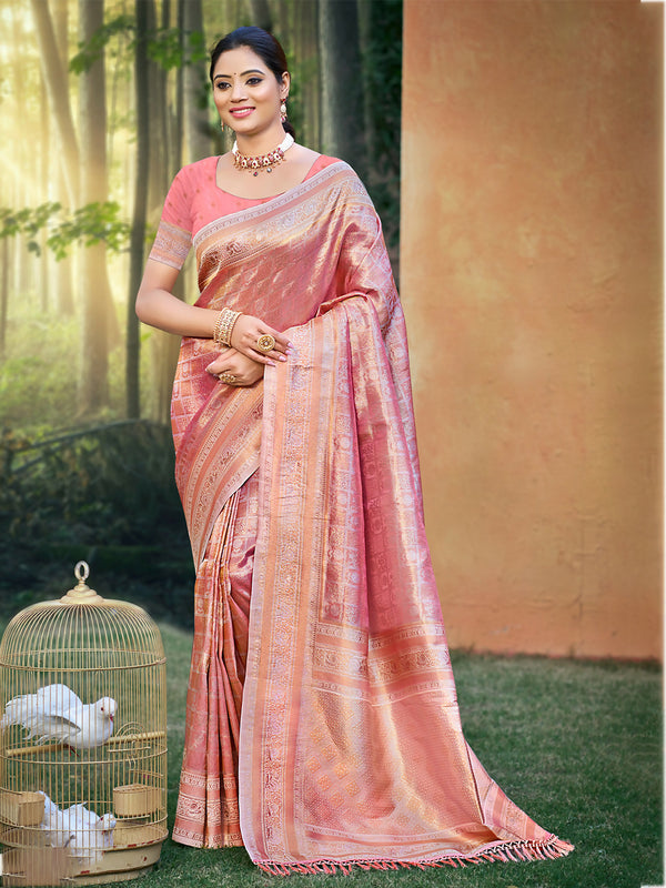 Sangam Prints Pastel Pink Kanjivaram Silk Woven Work Traditional Saree - Free Size