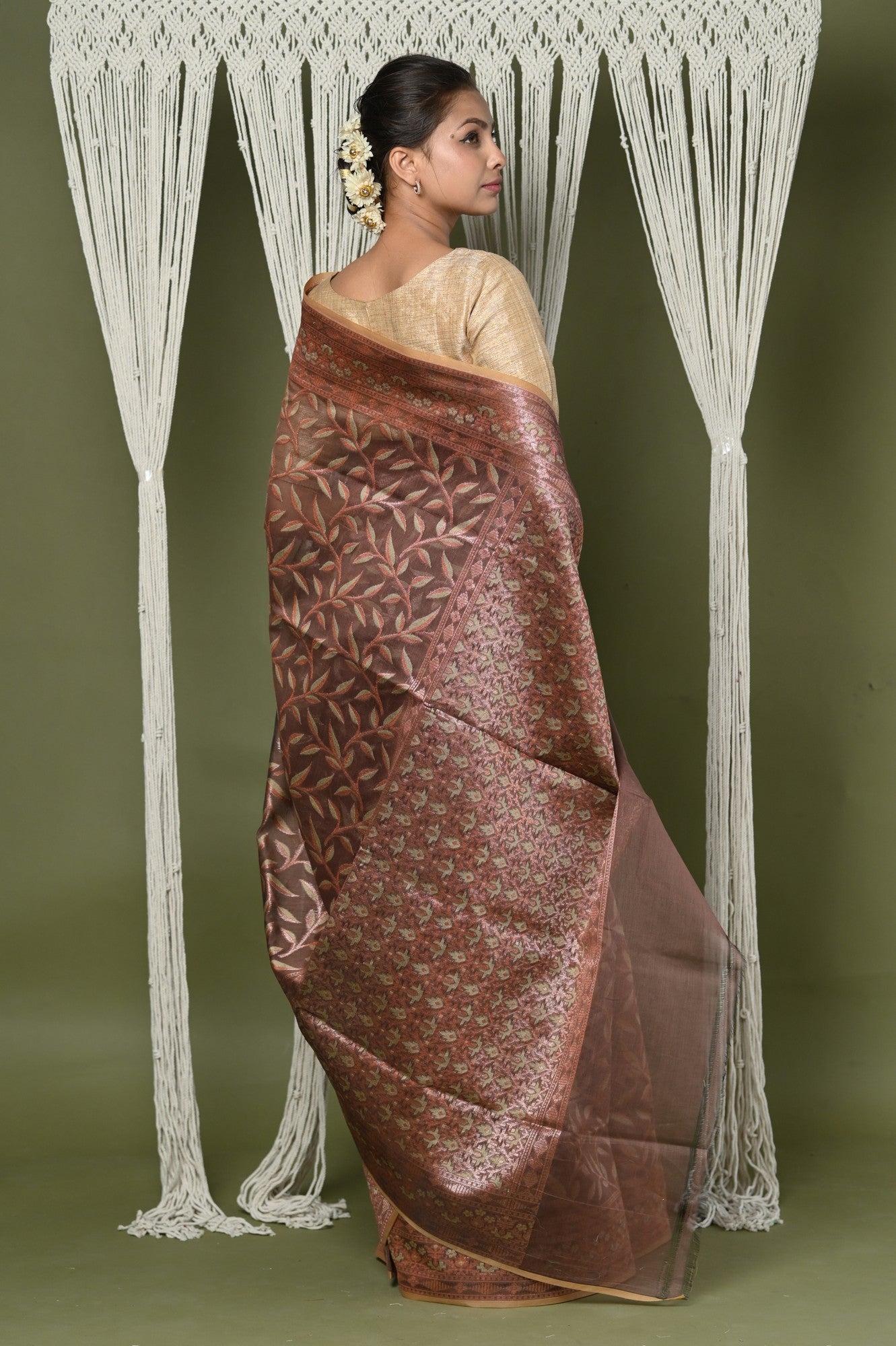 Handwoven by skilled weavers, these sarees have are prepared with fine cotton threads. The beautiful floral print of this saree enchants with the symphony of nature bringing a natural elegance to the saree.