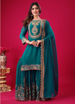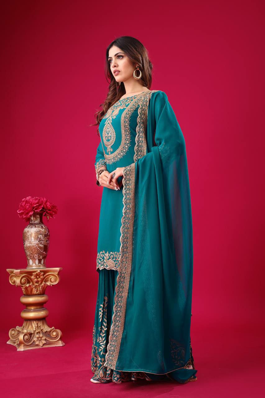 Prazu Fashion Turquoise Georgette Embroidered Palazzo Suit