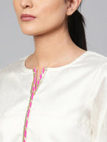 • Off-White and pink printed straight calf length kurta, has a notched round neck, three-quarter sleeves, side slits