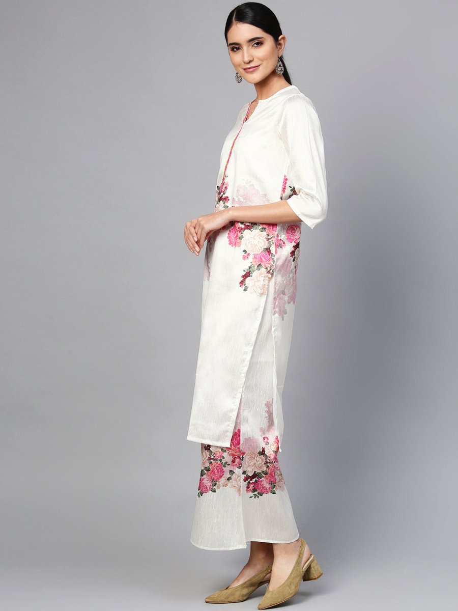 • Off-White and pink printed kurta with palazzos and dupatta