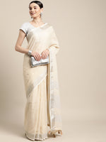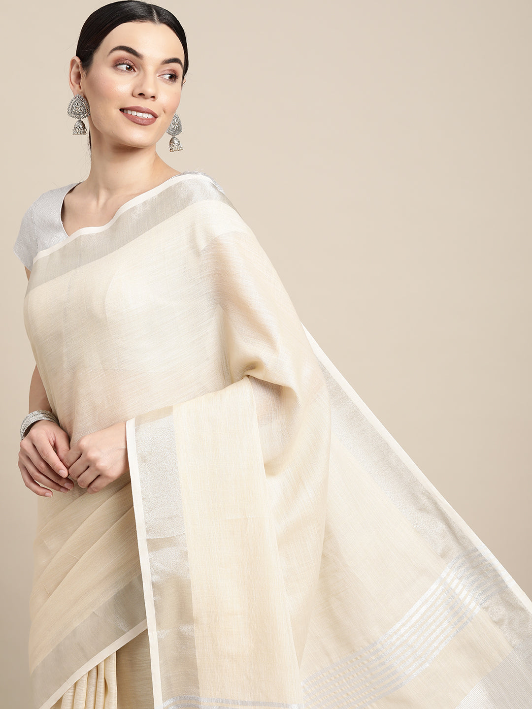 Astita Elegant Beige Woven Linen Saree with Contrast Zari Border & Tassels - Soft & Breathable Party Wear - Default Title