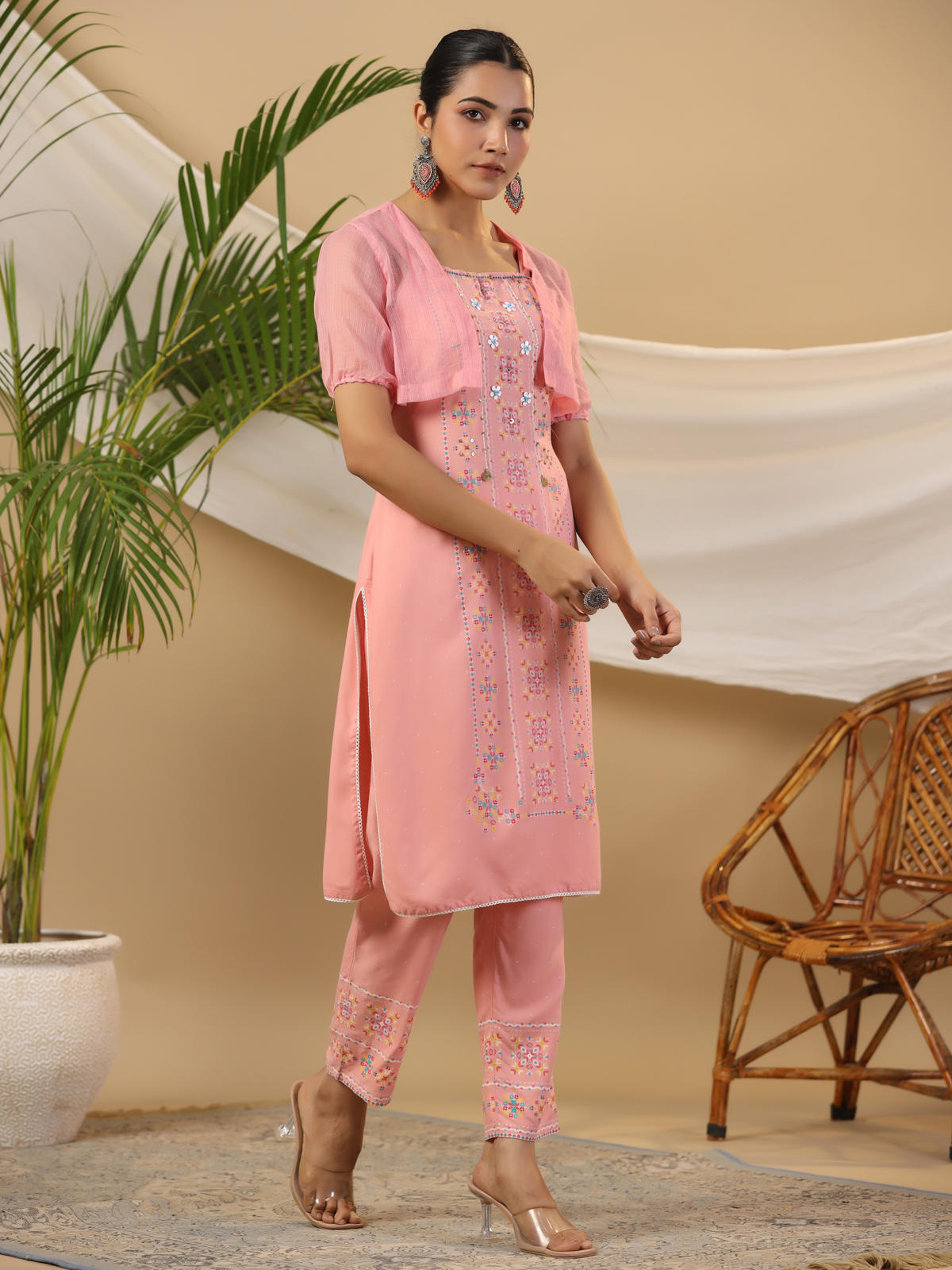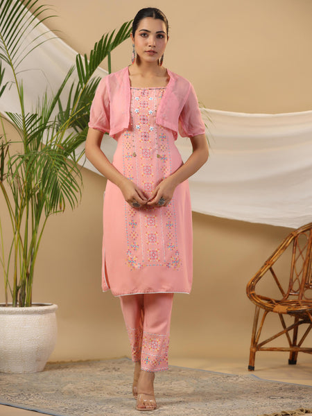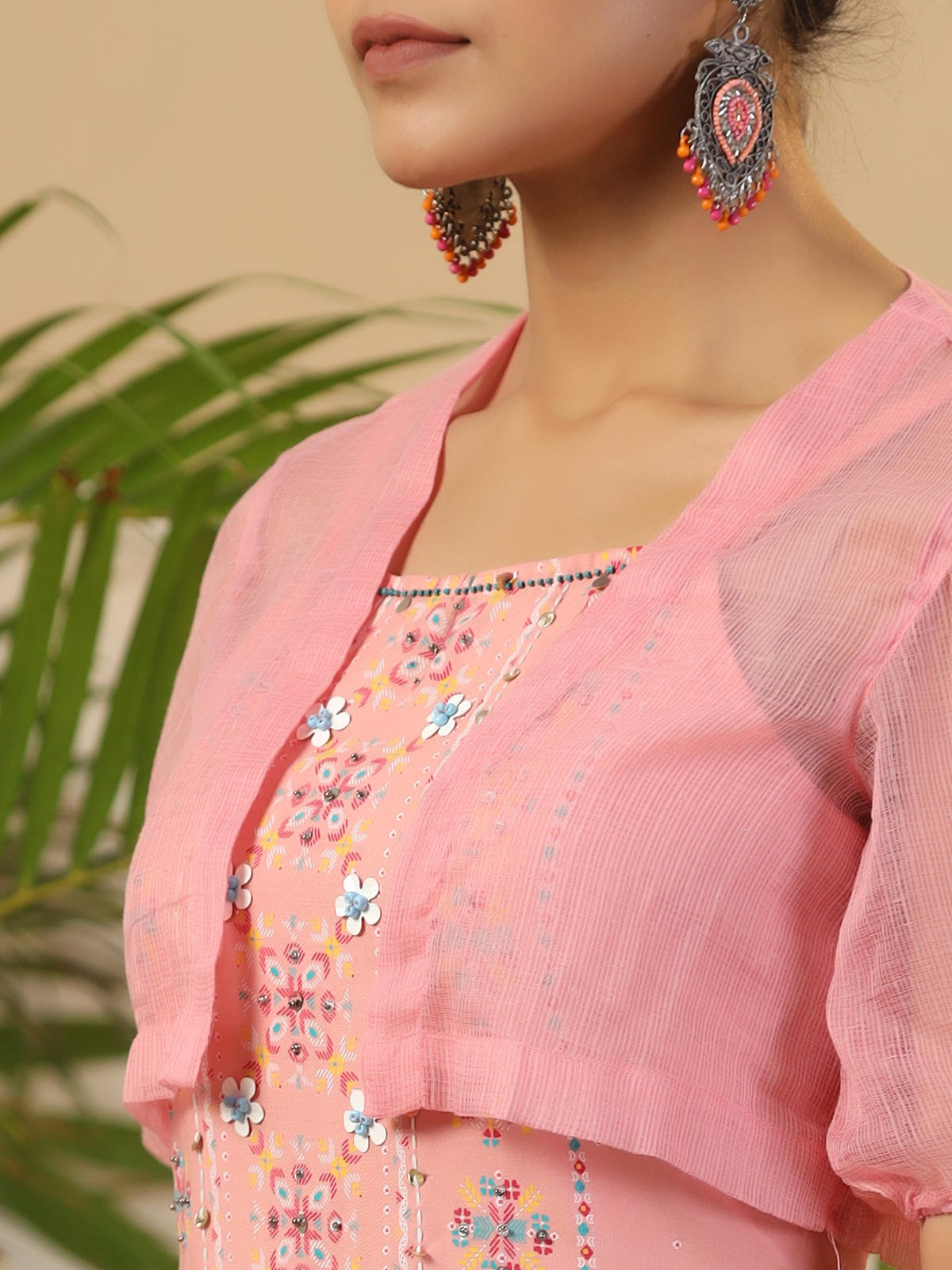 Juniper Women's Peach Geometric Printed Rayon Kurta Pants & Jacket With Sequins Work - Distacart