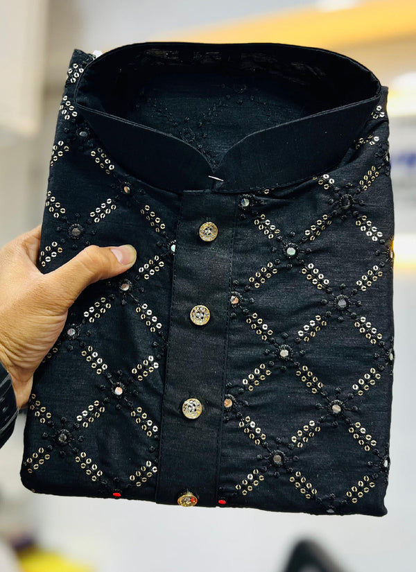 Prazu Fashion Black Silk Sequence Work Kurta With Pajama - M(38)