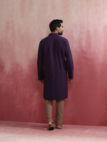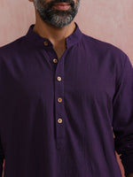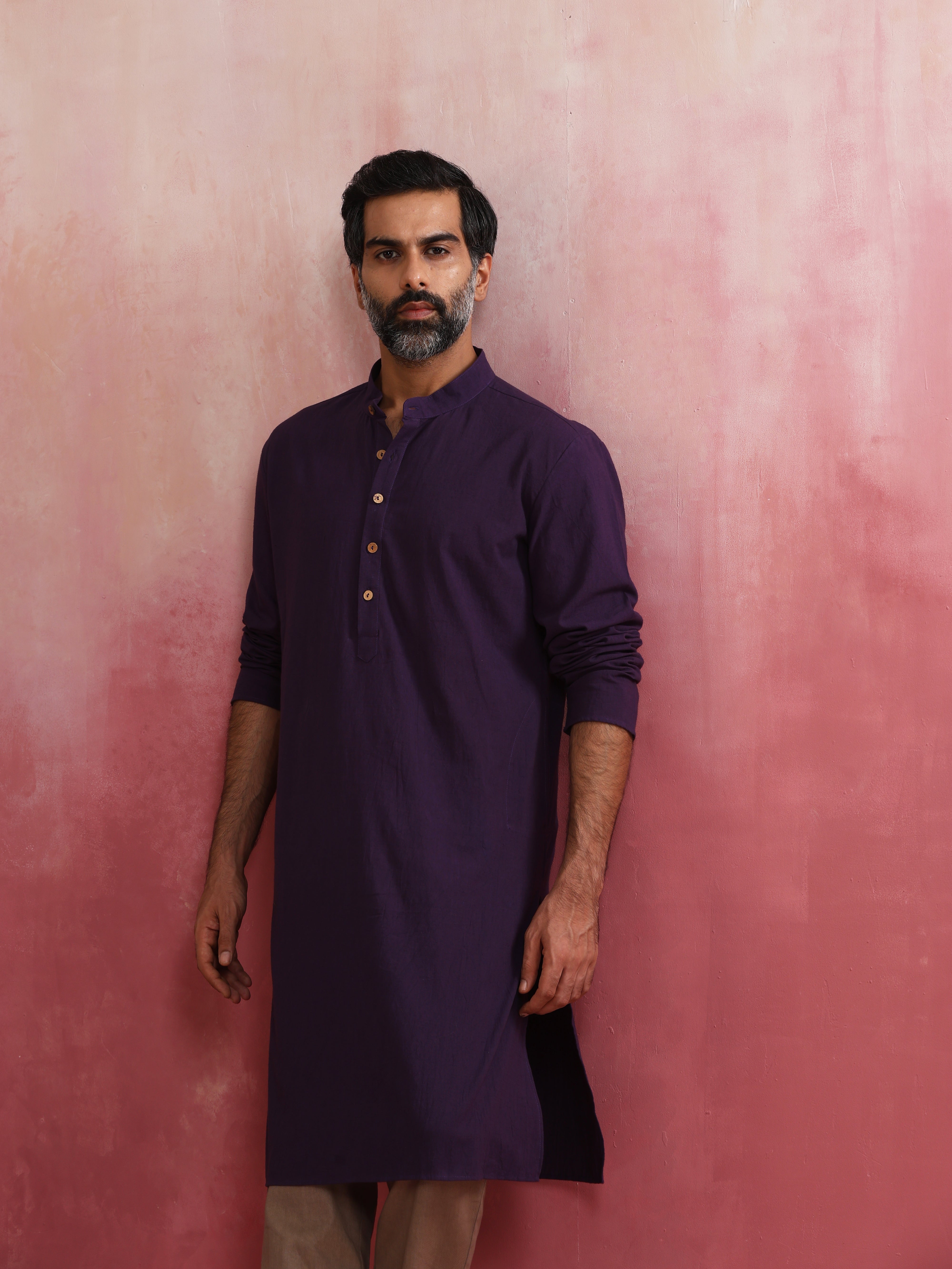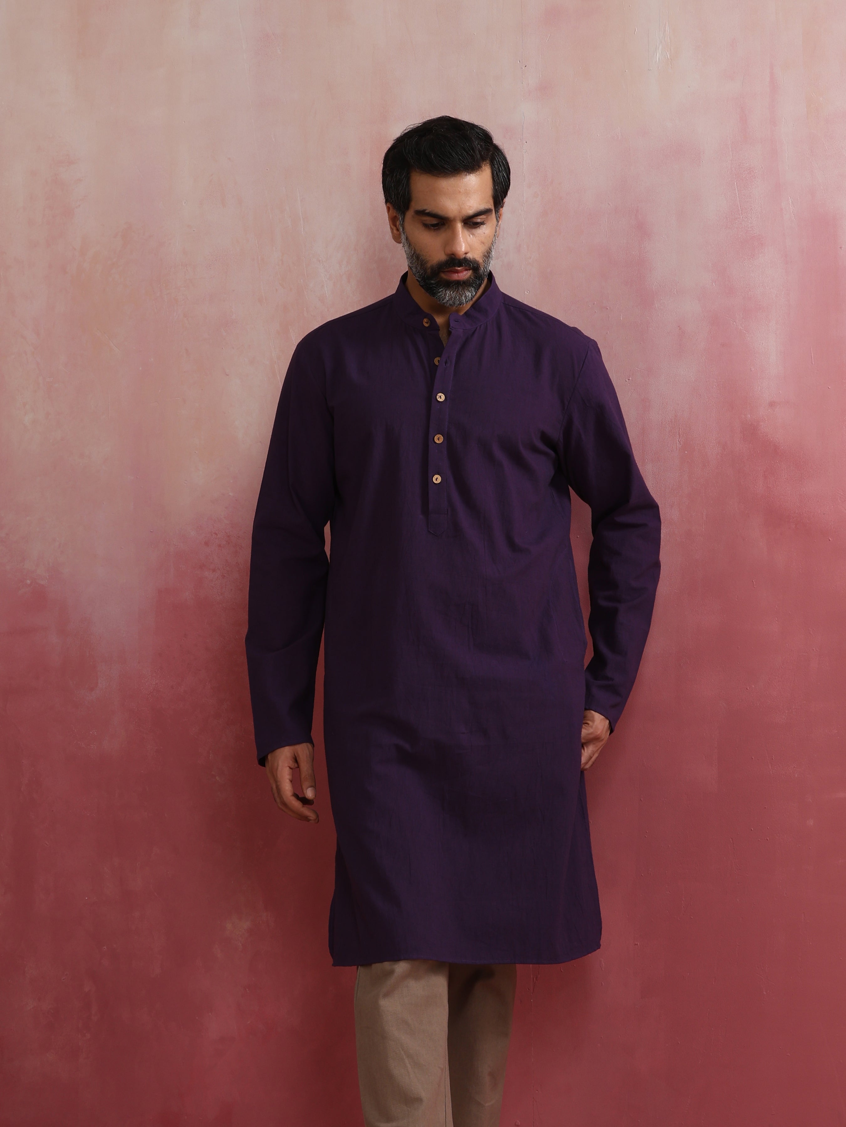 Upgrade your festive wardrobe with this elegant purple cotton kurta, featuring a classic mandarin collar, knee length and full sleeves.