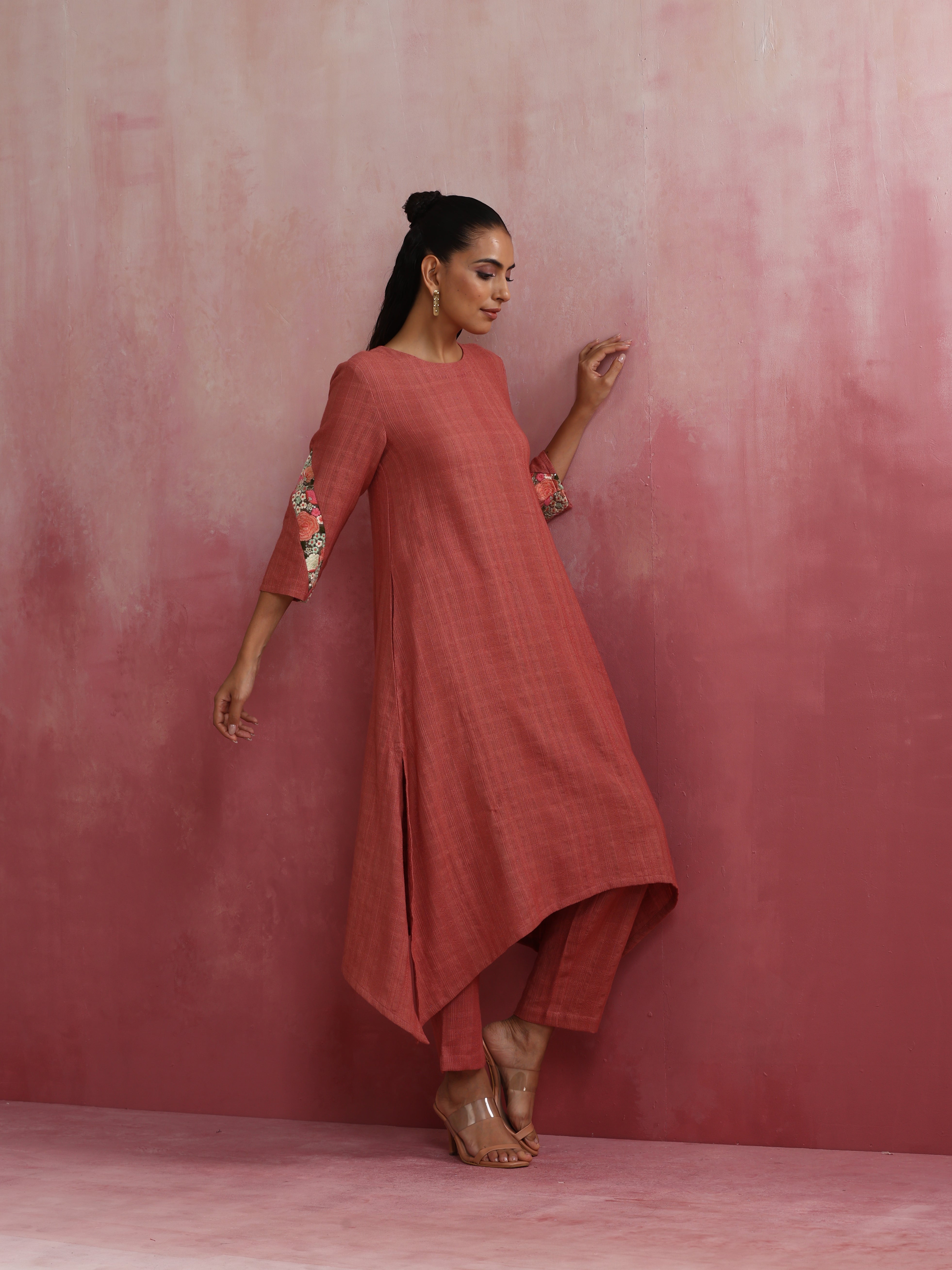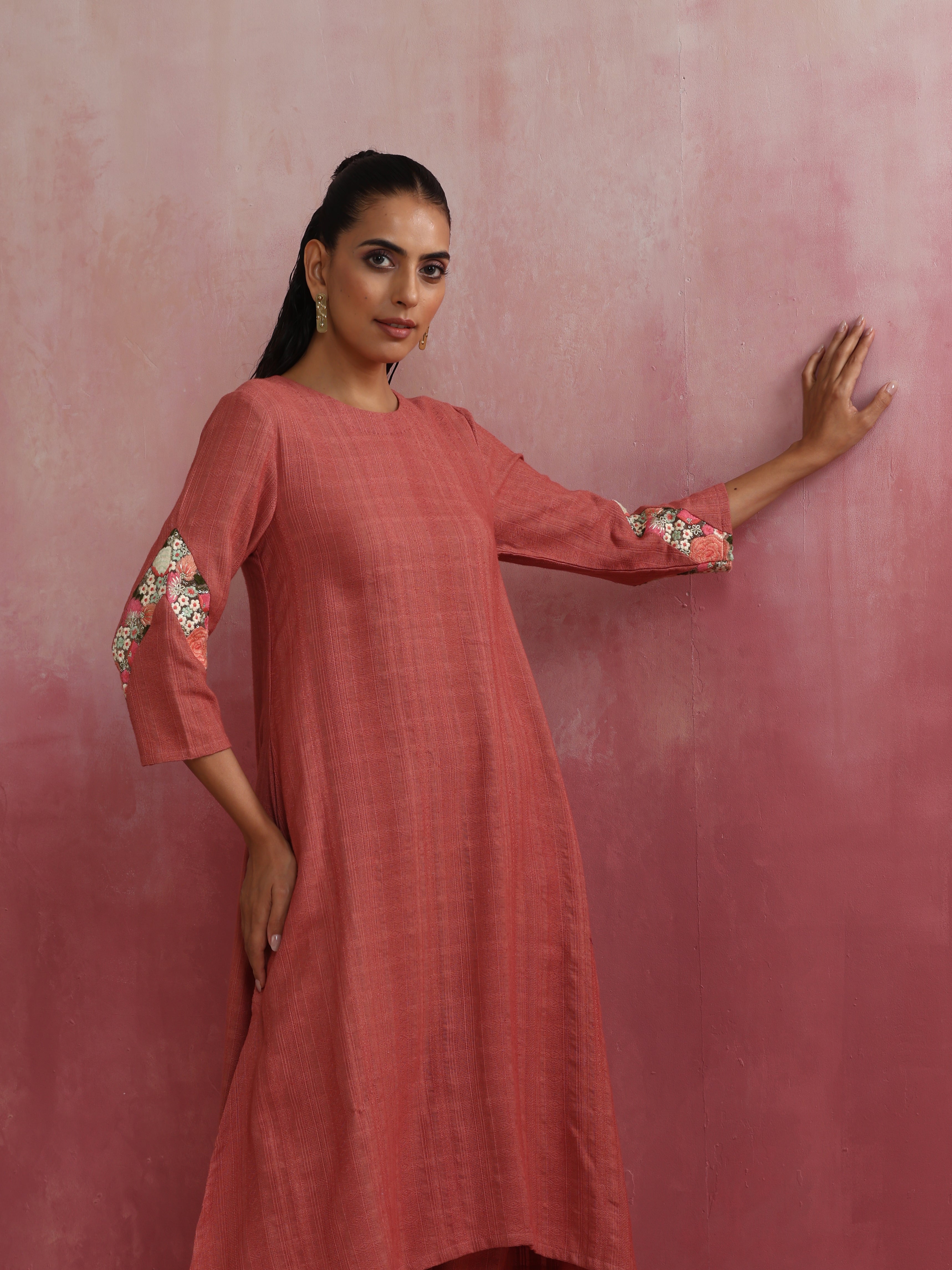 • Elevate your style with this peach cotton dobby kurta with 3/4th sleeves.