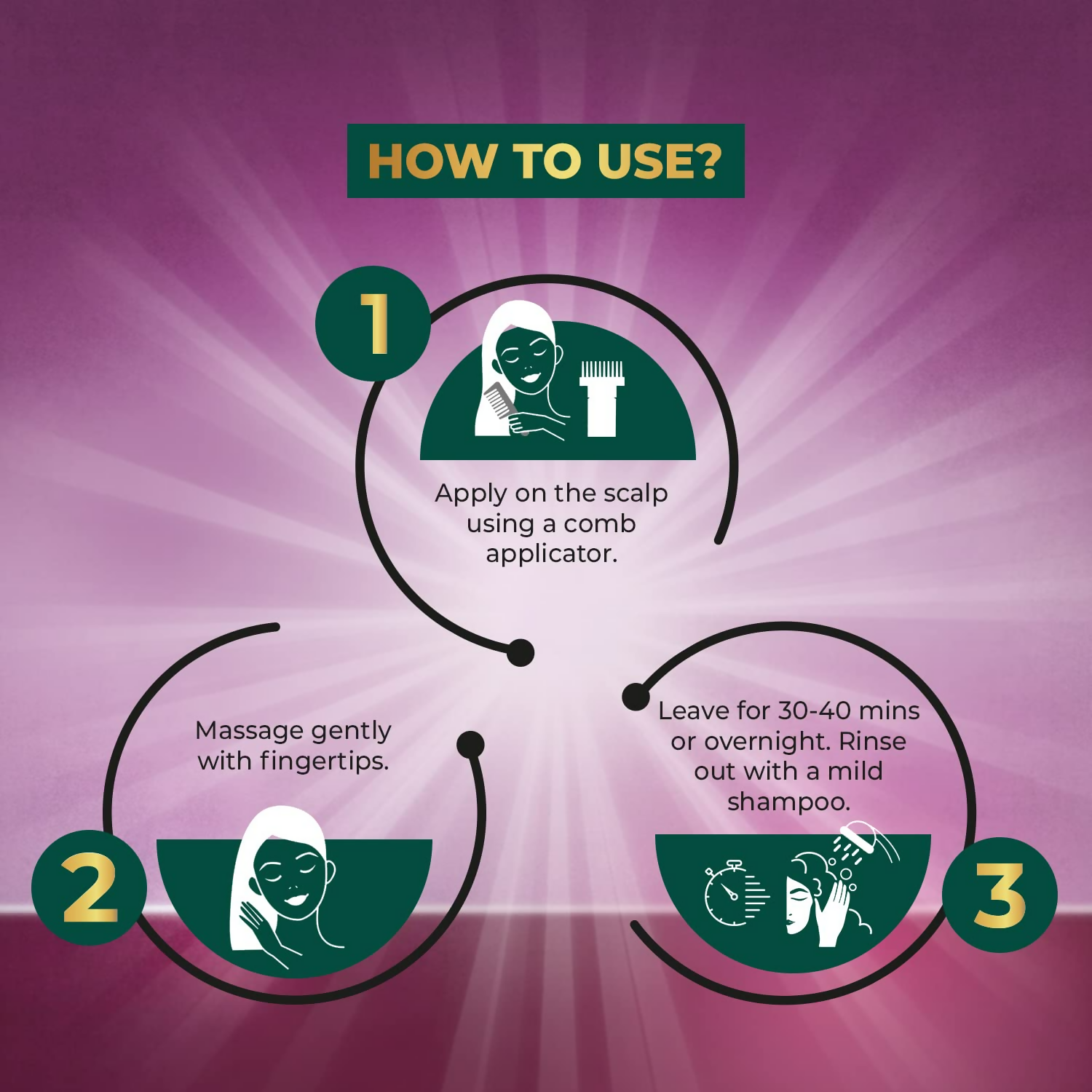• Apply on the scalp using a comb applicator. Massage gently with the fingertips. Leave for 30-40 minutes or overnight. Wash out with a mild shampoo.