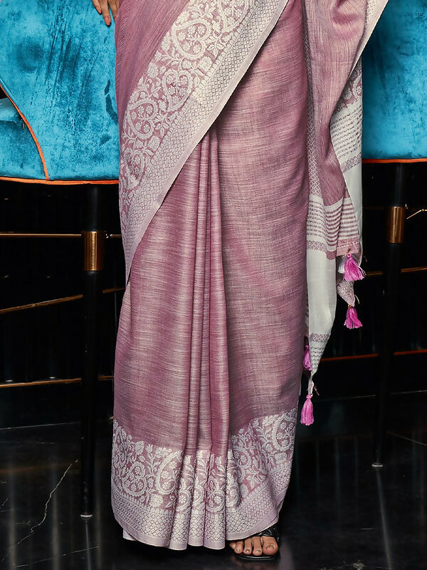 Astita Elegant Mauve Woven Linen Saree with Contrast Zari Border & Tassels - Soft & Breathable Party Wear