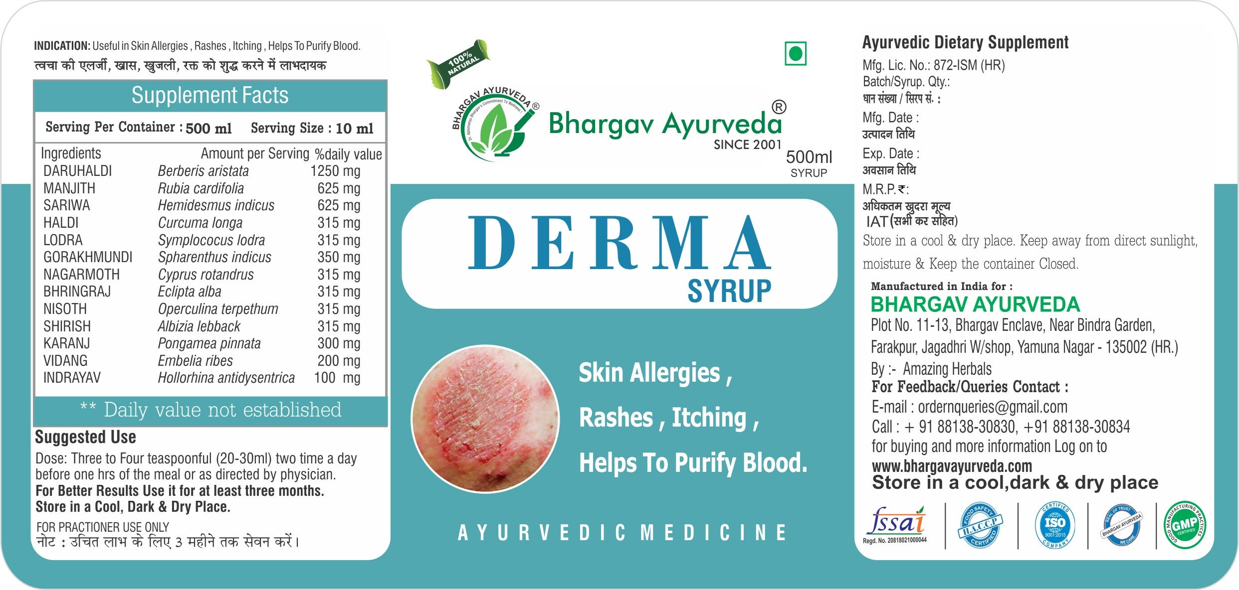 Dr.Bhargav’s Derma Syrup Ingredients:Daruhaldi , manjith , sariwa,Gorakhmundi, Bhringraj, Vidang, Karajn,NisothetcHow to use:As suggested by the ex...