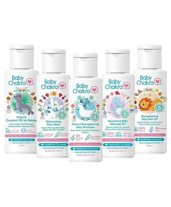 BabyChakra Wash, Shampoo, Massage Oil Hair Oil & Coconut Oil for Babies ComboThis Combo Contains: 1. Baby Wash - 30 ml 2. Baby Shampoo - 30 ml ...